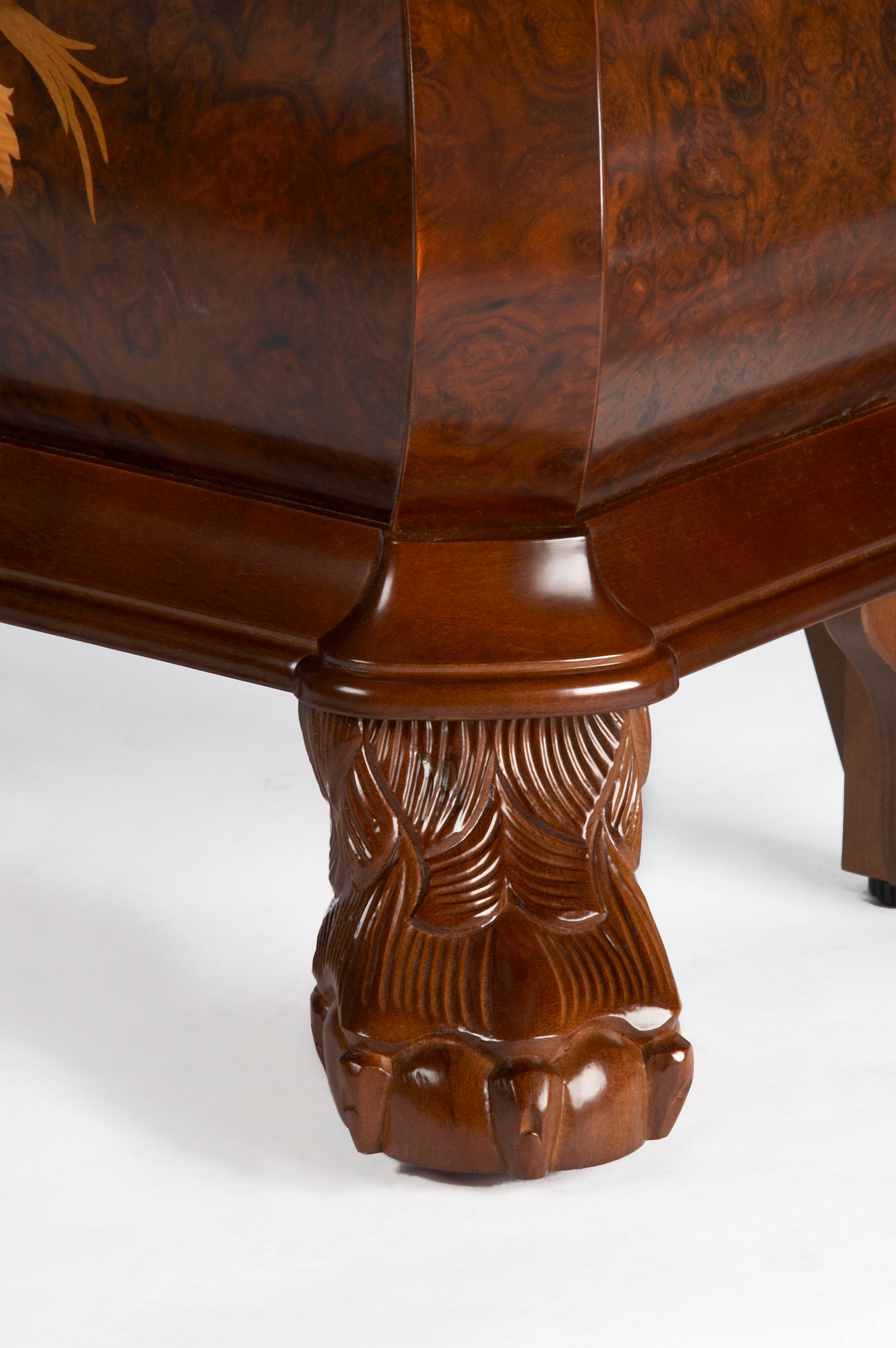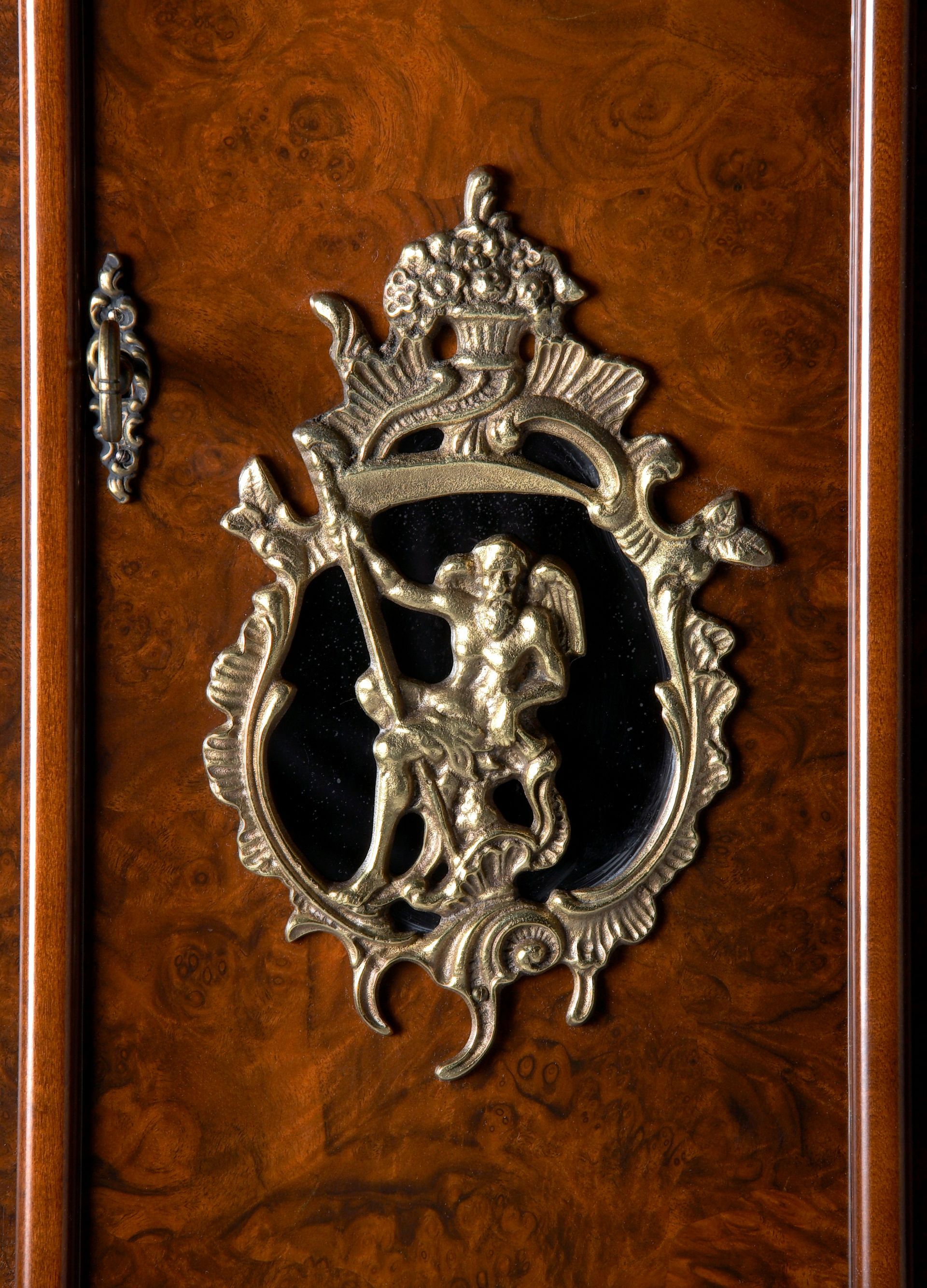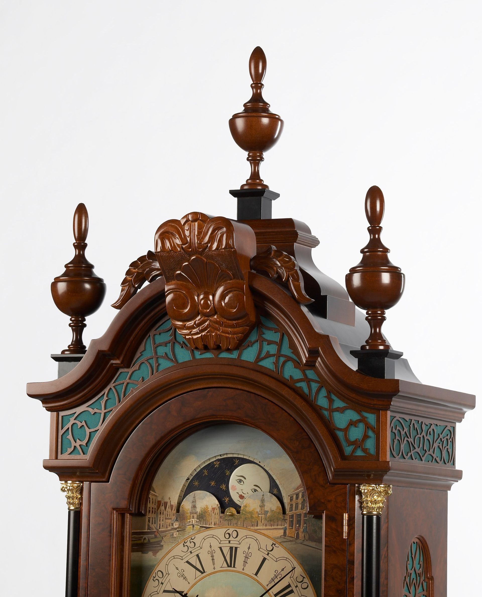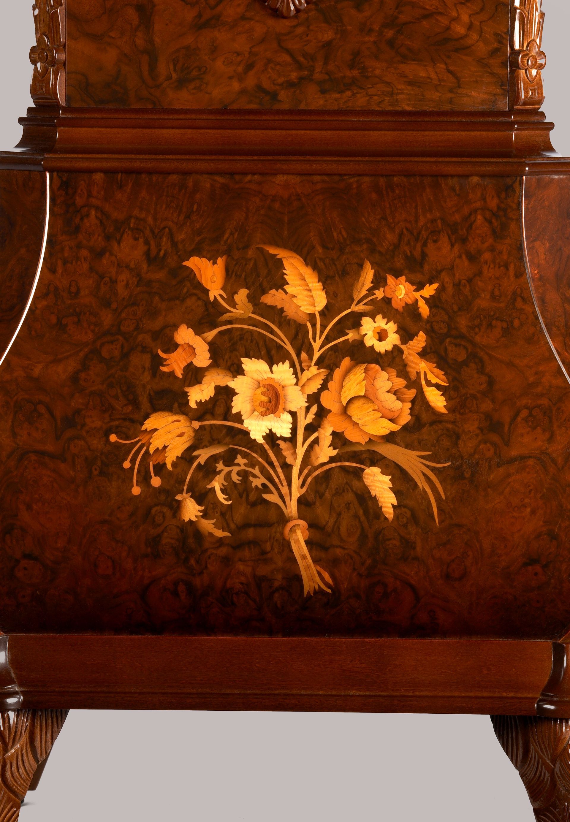 - Traditioneel Amsterdams Staand Horloge volledig in wortelnoten met decoratief intarsia en dubbele kap met filigrain bewerking.