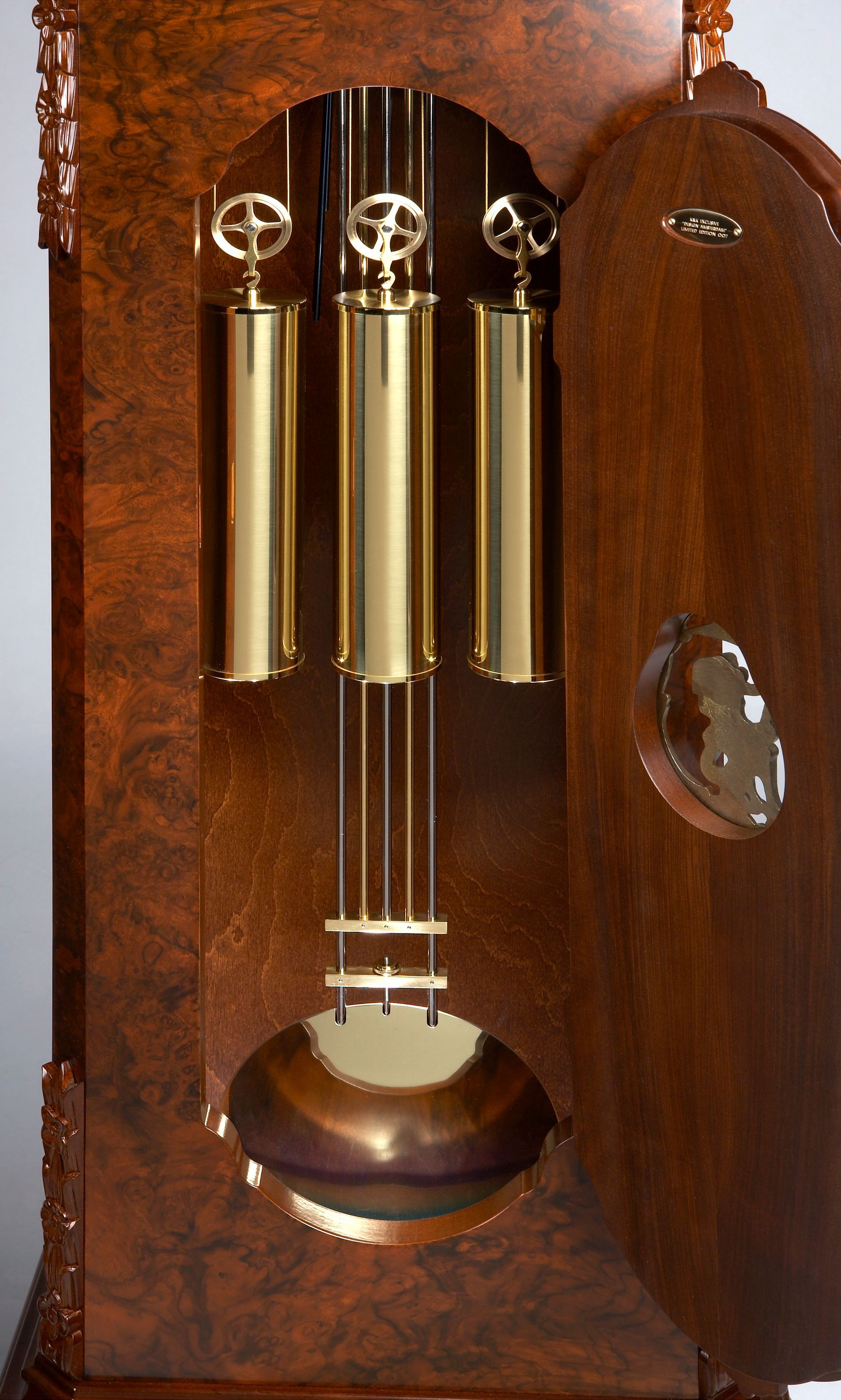 - De klok wordt geleverd met speciaal voor deze klok gegoten beelden en handgedraaide houten knoppen.