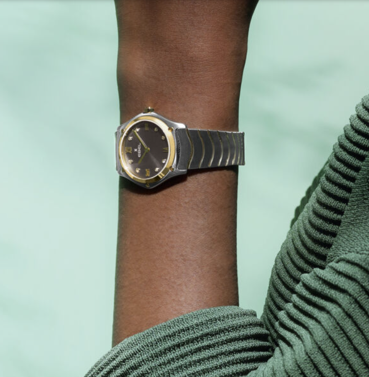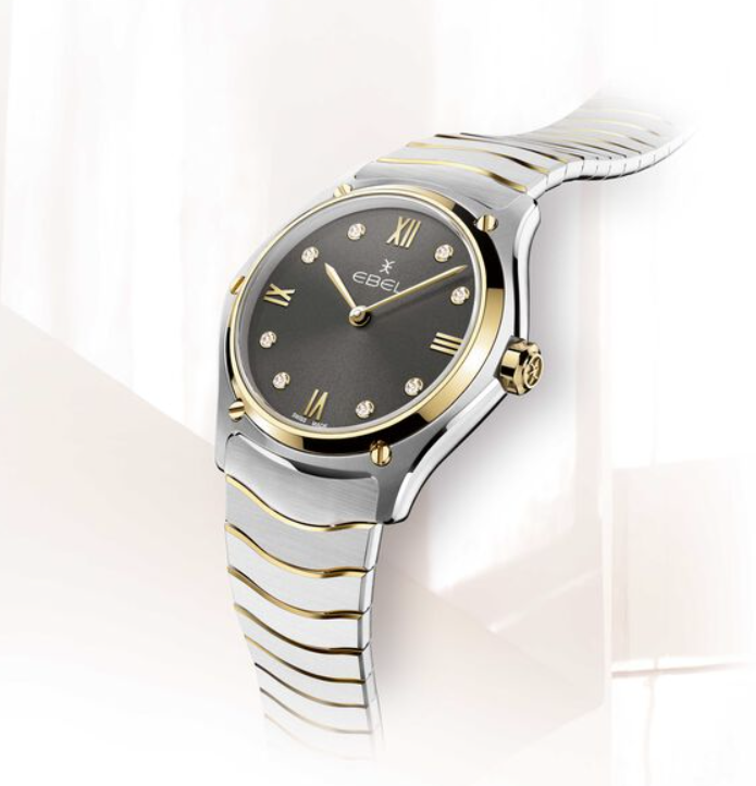 EBEL Sport Classic - 1216419A dames pols horloge. Edelstalen kast gecombineerd met 18 karaat geel goud. Ø 29 mm. Antraciet grijze wijzerplaat met Romeinse cijfers en 8 diamanten ( 0,052 crt ). Ontspiegeld Saffier glas. Edelstalen Wave band met goud accenten en klap sluiting. Zwitsers quartz uurwerk. 5 ATM waterdicht.