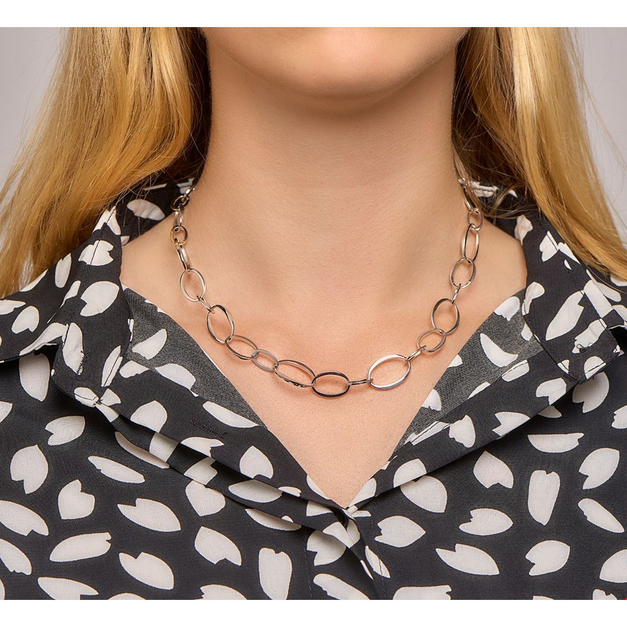 Beschrijving: Maak uw look compleet met dit bijzondere collier met ovale schakels. Het gerhodineerd zilveren collier heeft een draaglengte van 45cm en een stevige karabijn sluiting.