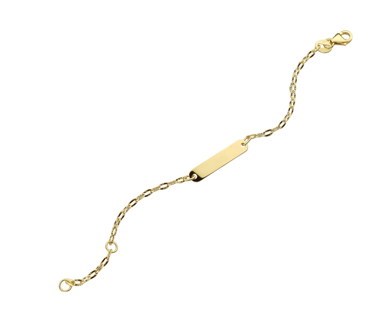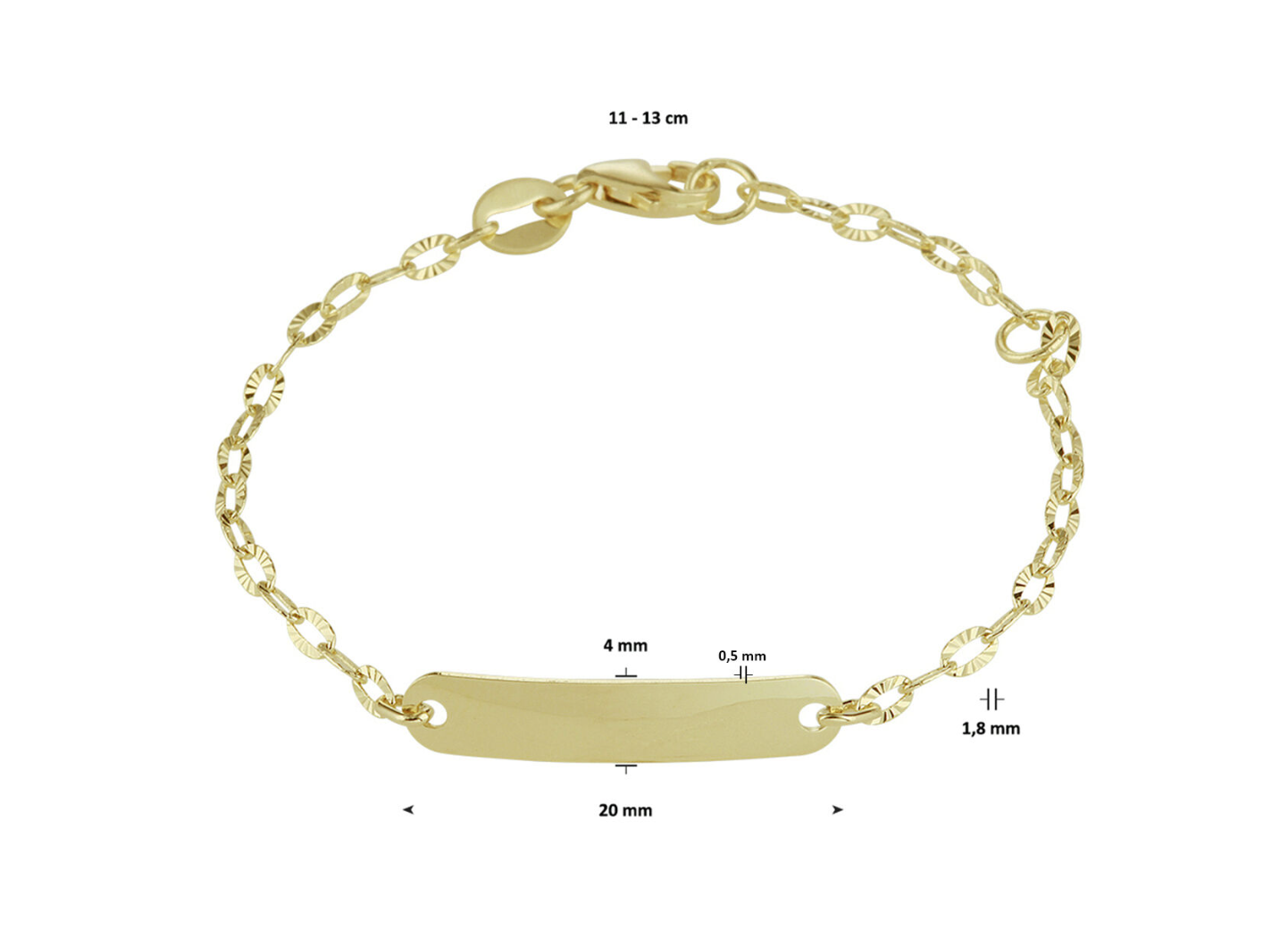 14k Geelgouden armband met graveerplaat van 4x20mm met een dikte van 0.5mm en een stevige karabijnsluiting. De armband heeft draaglengtes van 11 en 13cm. De schakelbreedte is 1.8mm.