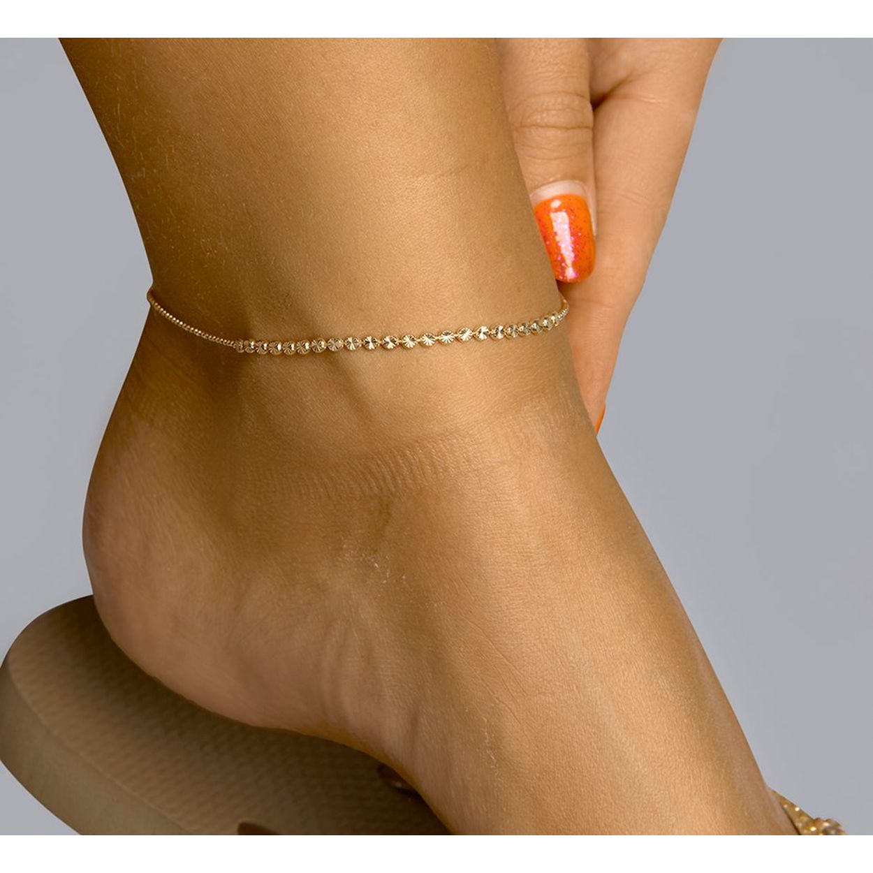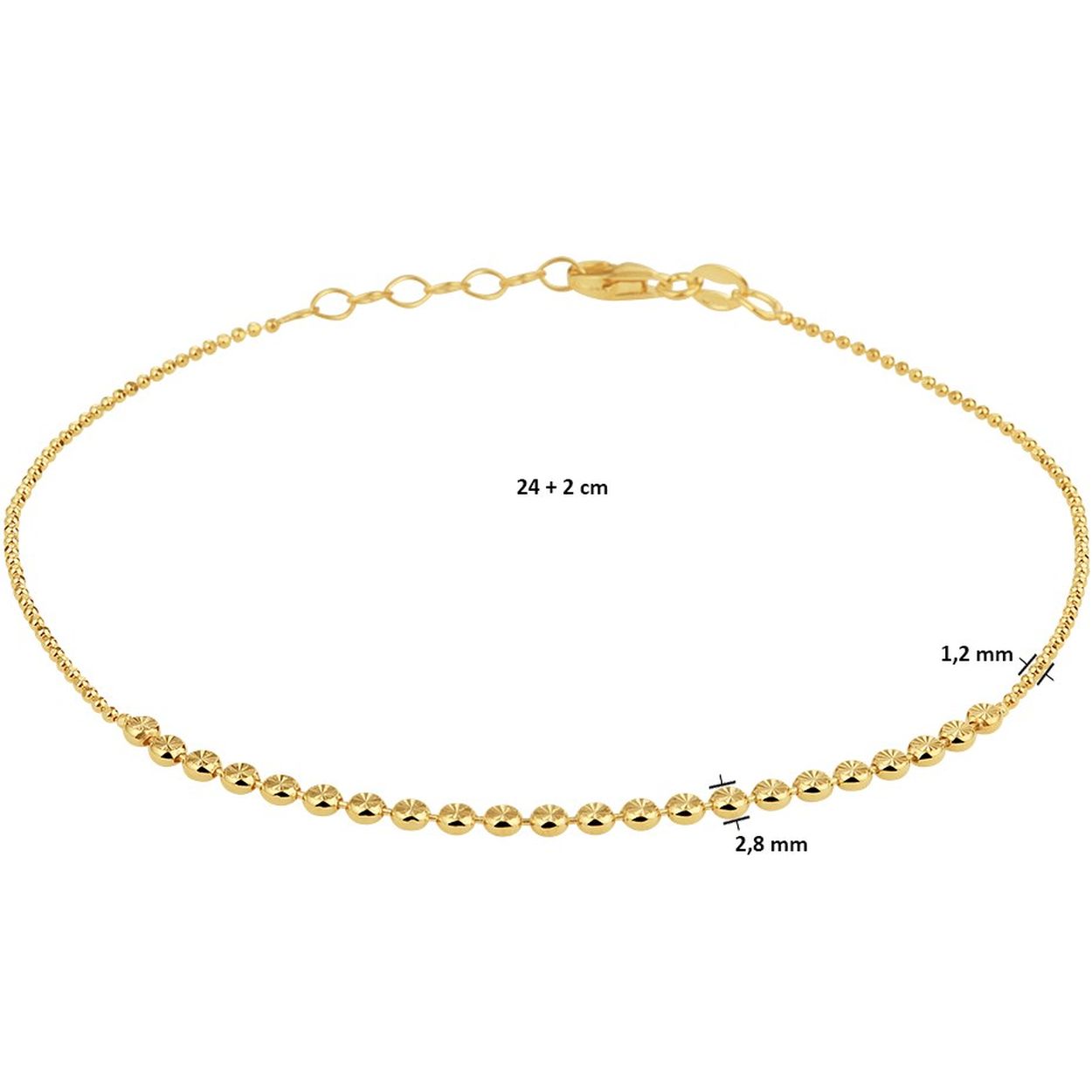 Geelgoud op 925 zilveren enkelbandje uitgevoerd met rondjes met een gediamanteerde afwerking en een stevige karabijn sluiting. Het enkelbandje heeft een draaglengte van 24cm met een extensie van 2cm en een breedte van 2.8mm.
