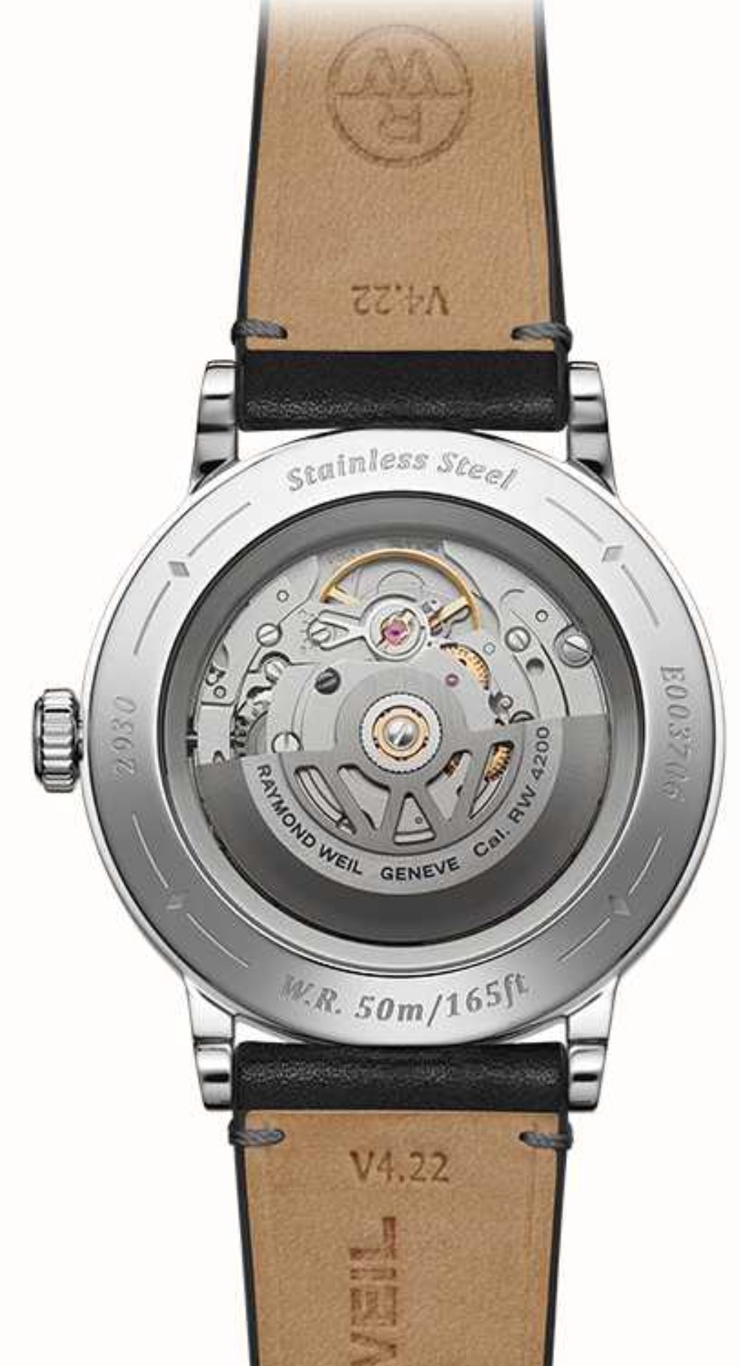 Een saffieren achterkant van de kast biedt zicht op het zelfopwindende uurwerk binnenin en het "W-vormige" oscillerende gewicht, de uurwerksignatuur van RAYMOND WEIL. De band van echt kalfsleer is voorzien van een uniek W-gestikt detail.