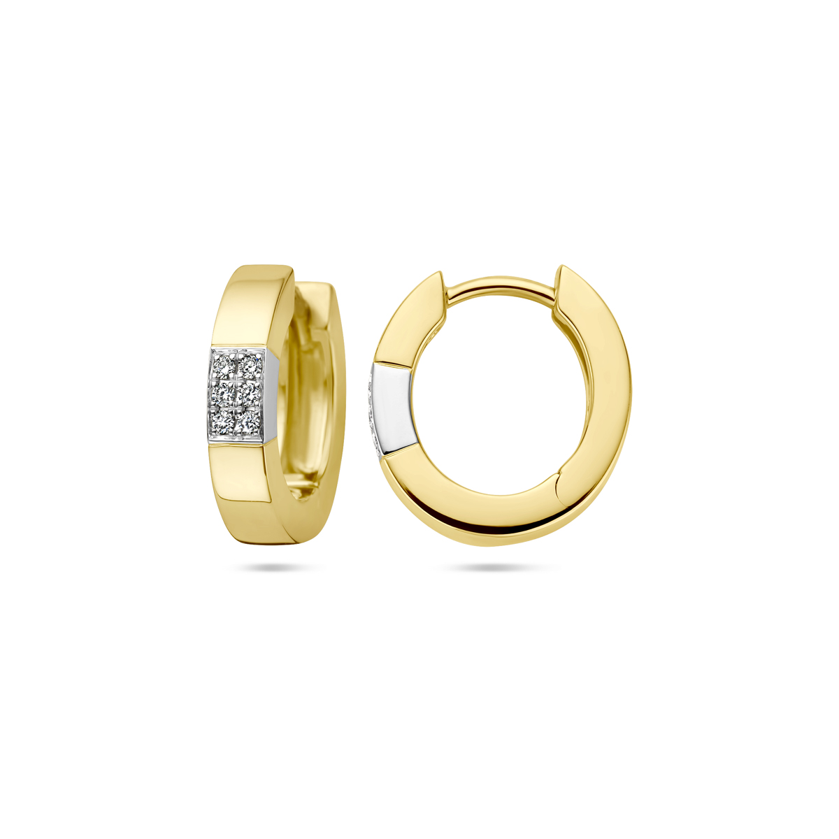 14 Karaat bicolor geel- en witgouden klapoorringen met een afmeting van 13.5x3mm. Uitgevoerd met een 0.07 diamant H/SI.