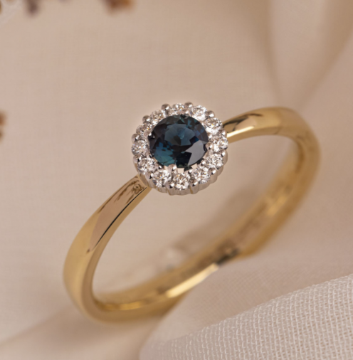 14 KARAAT GEEL- MET WITGOUDEN BICOLOR ENTOURAGE RING MODEL CONCA MET BRILJANT EN BLAUW SAFFIER