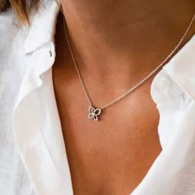 Vlinder hangertje, inclusief collier. Het collier is 42 + 3 cm. Dat betekent dat er een jasseron verlengstukje aan zit van 3 cm zodat u het hangertje kort kunt dragen of op 45 cm.