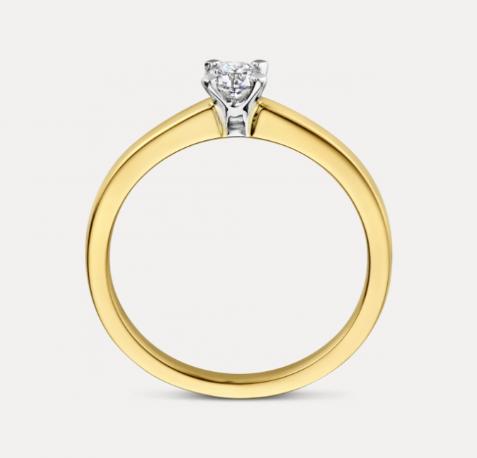 14 KARAAT GEEL- MET WITGOUDEN SOLITAIR RING MET DAARIN 1 BRILJANT VAN 0.07 CARAAT MODEL QUATTRO.