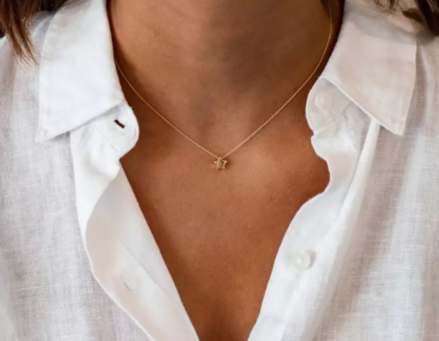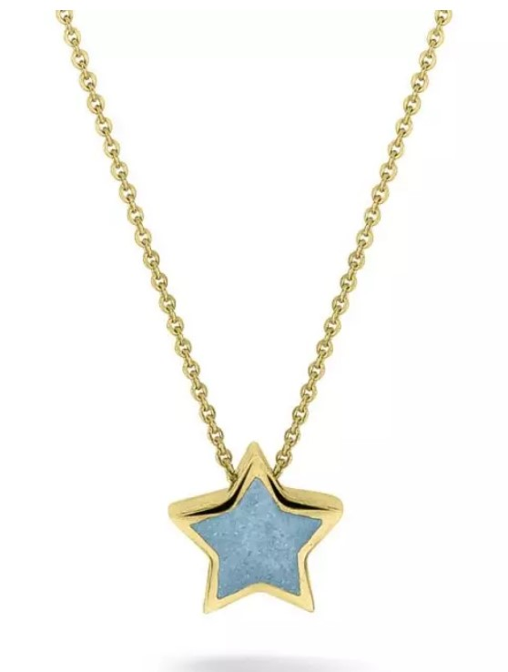 Ster hanger, inclusief collier. 14 karaat geelgoud. Het collier gaat door het sterretje heen waardoor de ster heen en weer kan bewegen. De ‘voorkant’ van het sterretje kan gevuld worden met eventueel as. U kunt het sterretje met de vulling naar voren dragen of juist tegen u aan. Ook is er ruimte om een vingerafdrukje op het gladde deel van de ster te zetten.