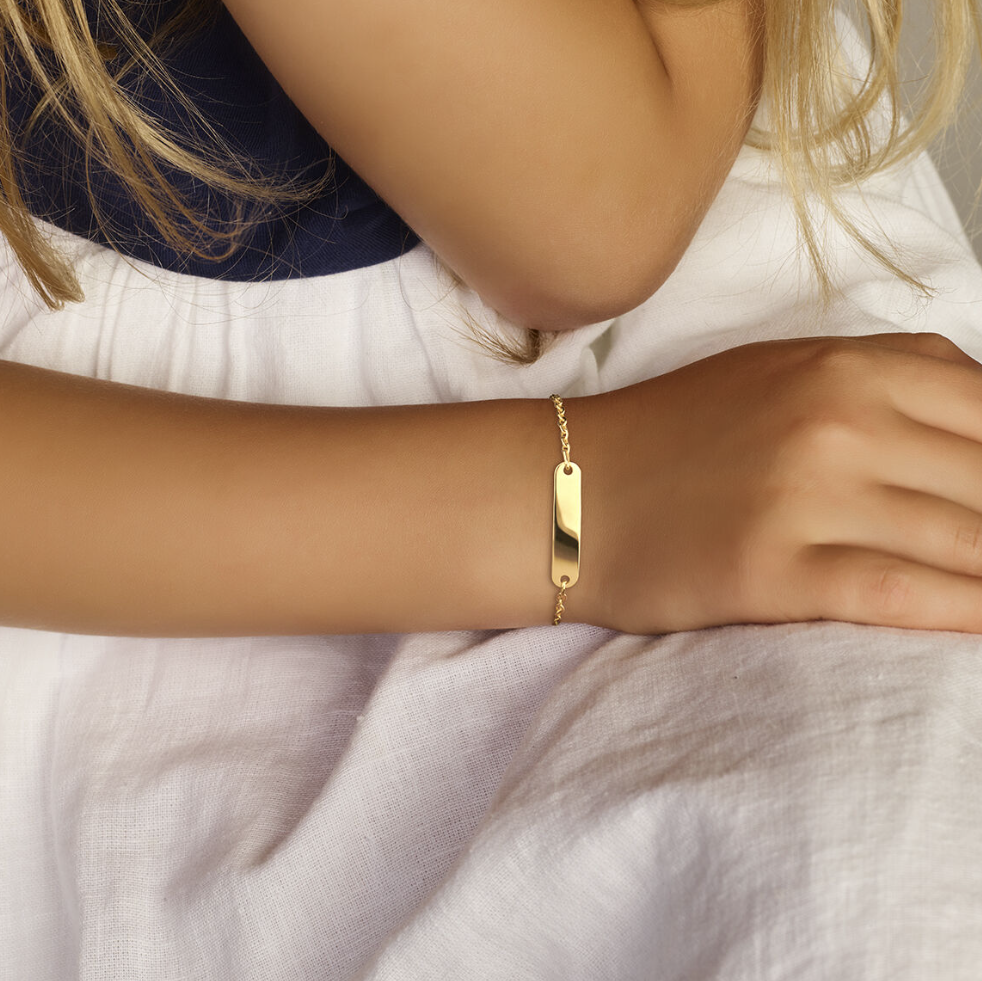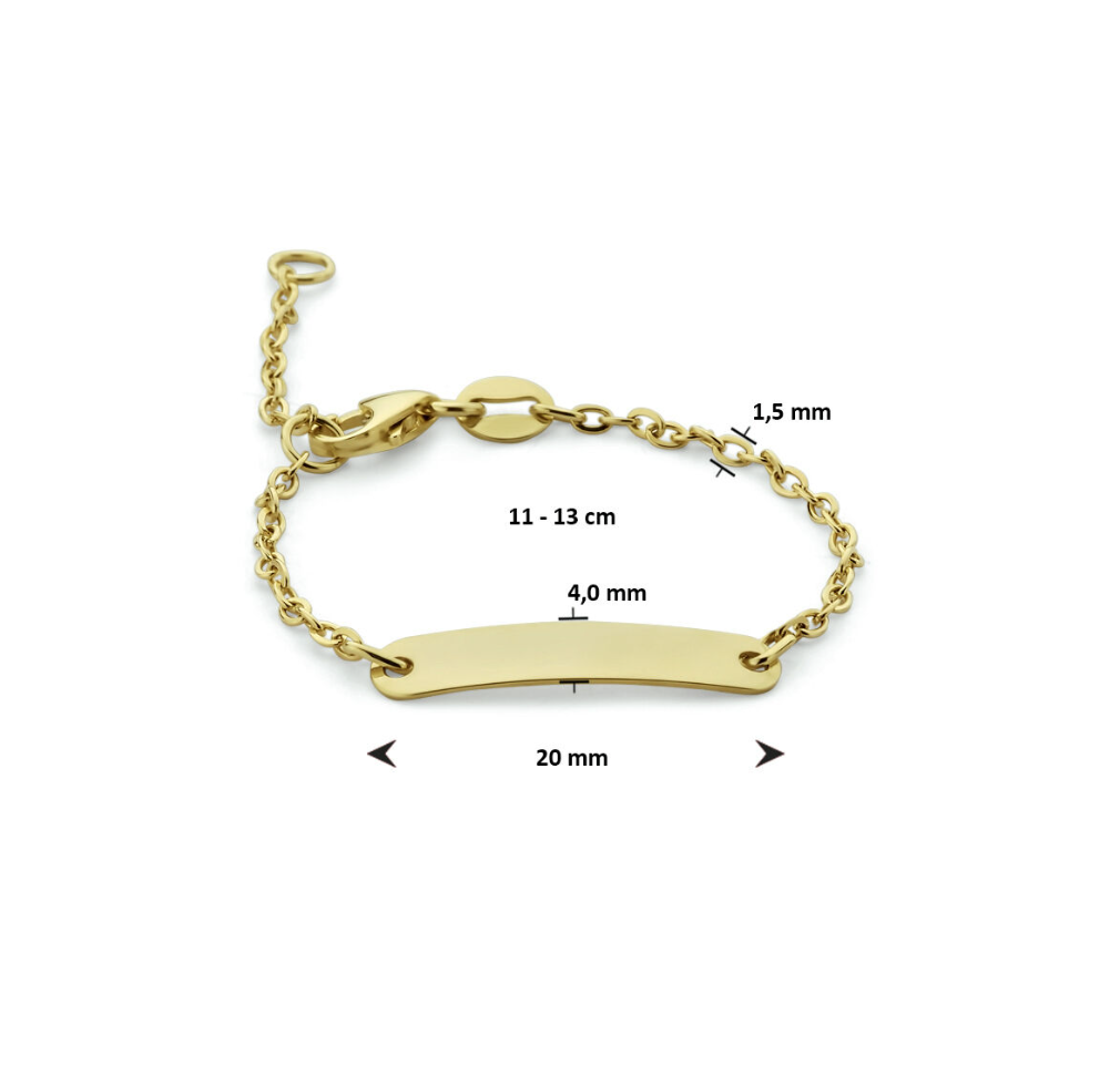 9k Geelgouden graveerarmband uitgevoerd met een graveerplaatje van 4x20mm en een dikte van 0.5mm. De armband heeft een stevige karabijn sluiting. De schakelbreedte is 1.5mm.