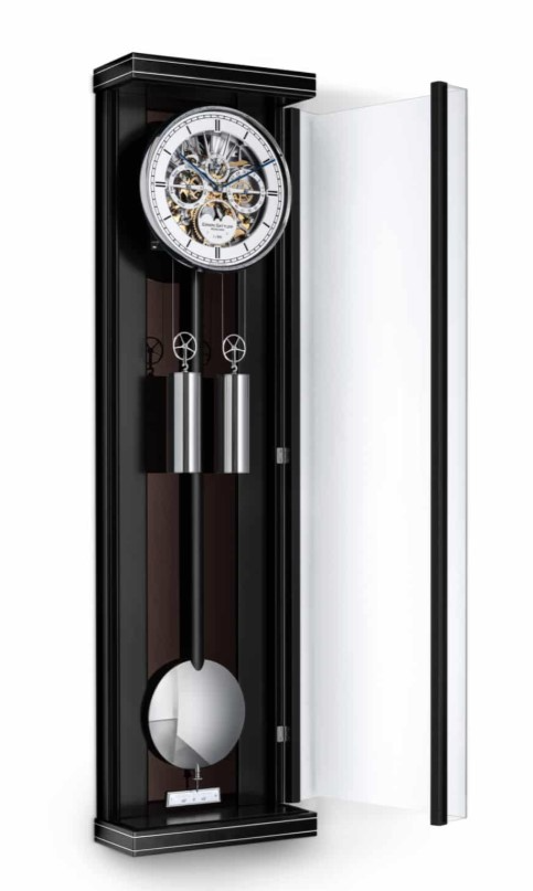 Vijfdelige open gewerkte wijzerplaat met gepolijste indexen. Hand bewerkte achter platine. Loopduur / gangreserve 30 dagen. Slagwerk op de hele en de halve uren. Geblauwd stalen hand bewerkte wijzers. 15 Robijnlagers en 8 precisie kogellagers.