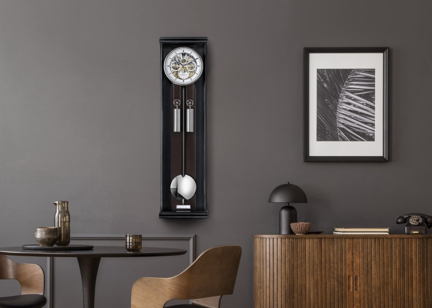 De wijzerplaat is voorzien van een dag en een datum aanduiding en een handbeschilderde maanaanduiding.