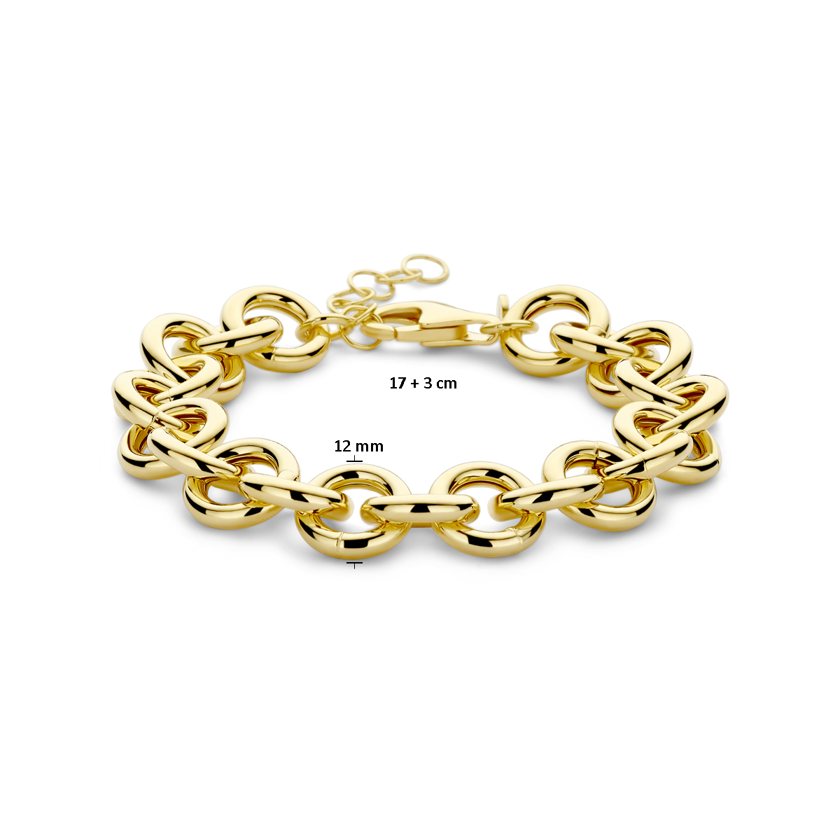 Geelgoud op 925 zilveren armband met een draaglengte van 17cm en een extensie van 3cm. Uitgevoerd met een karabijn sluiting. De schakelbreedte is 12mm. Geen garantie op plating.
