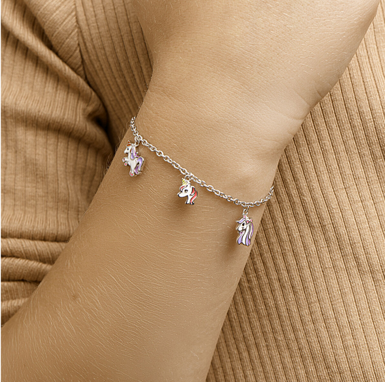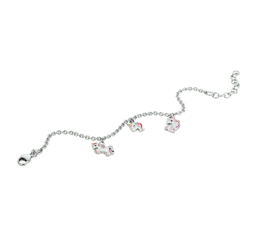 Gerhodineerd 925 zilveren armband uitgevoerd met drie verschillende hangers in de vorm van een eenhoorn en een stevige karabijn sluiting. De armband heeft een draaglengte van 13cm met een extensie van 3cm. De schakelbreedte is 1.8mm. De hangers hebben een afmeting van 10.5x9mm, 9x6,5mm en 11x7mm.