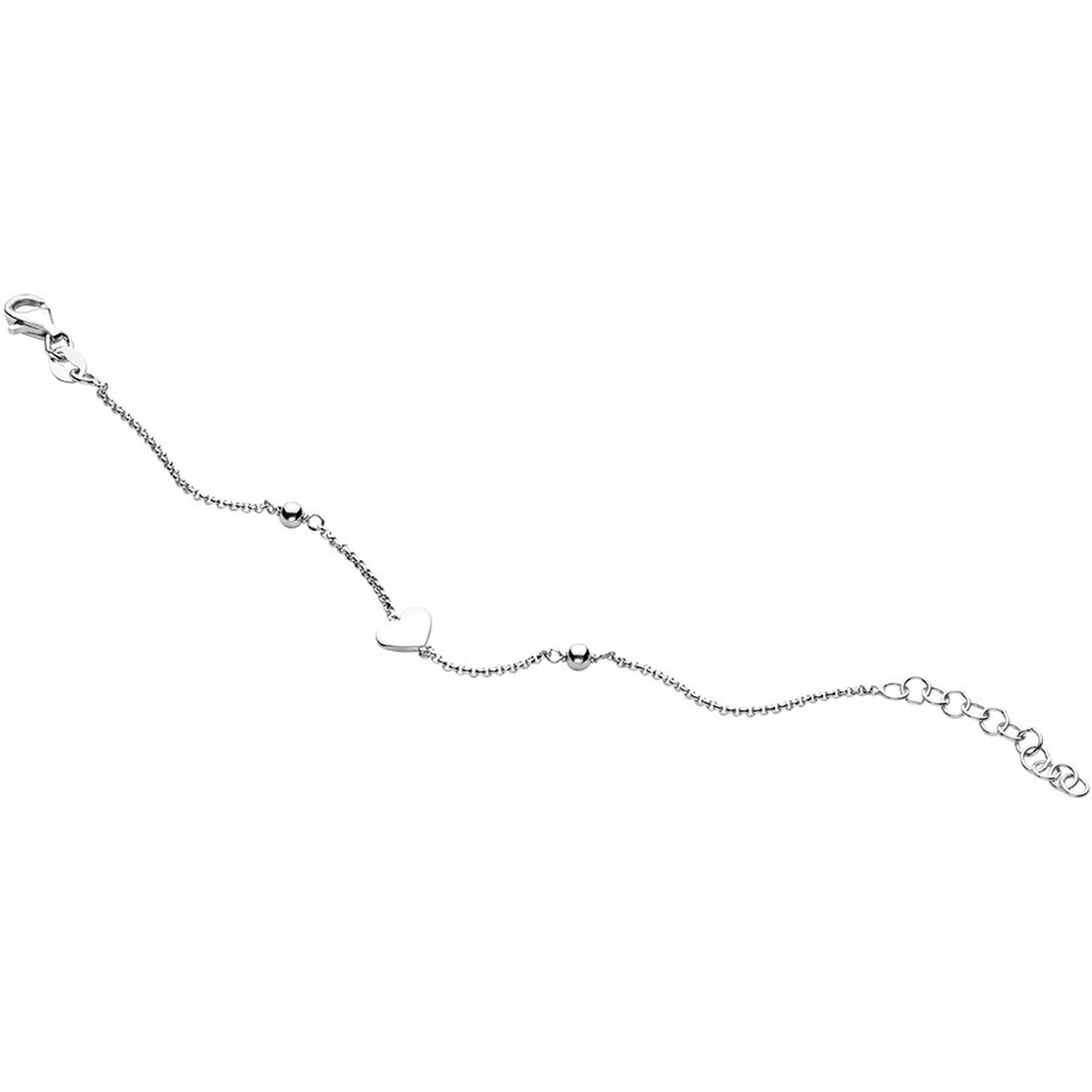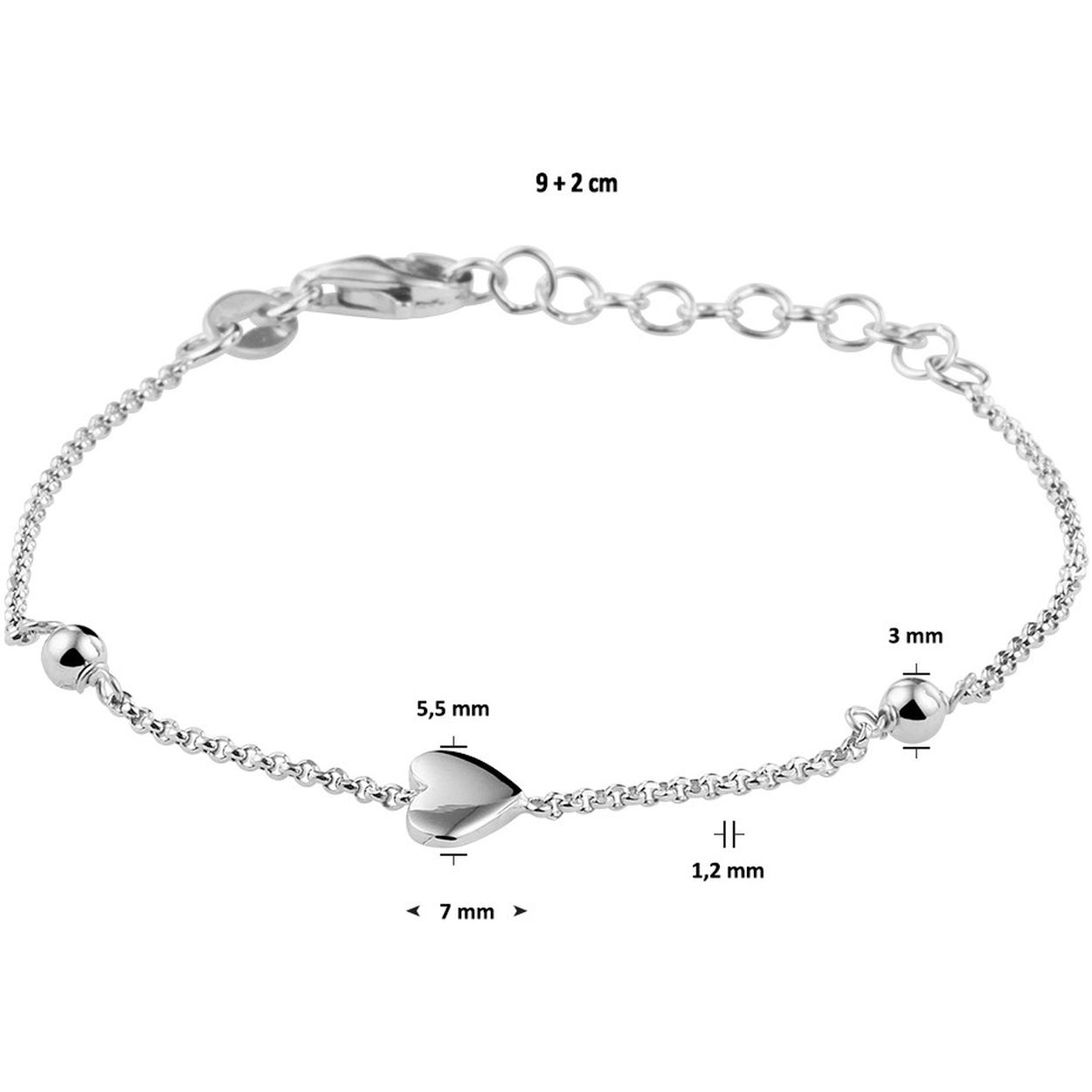 Schattige fijn gerhodineerd 925 zilveren armband uitgevoerd met een hart van 5.5x7mm, poli afgewerkte bolletjes van 3mm en een karabijn sluiting. De armband heeft een draaglengte van 9cm en een extensie van 2cm.