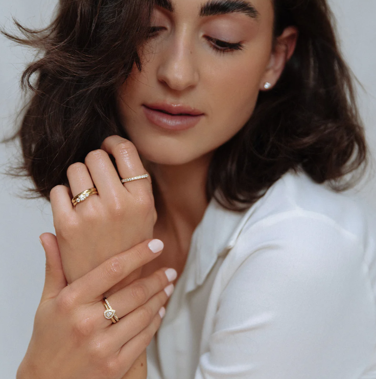 Een echte eyecatcher binnen de collectie is deze peervormige Elin ring! De fancy cut diamant is geslepen in peervorm en valt dan ook onmiddellijk op. De middensteen is bovendien omringd door kleinere briljant geslepen diamant voor een extra wauw-factor. De ring heeft een sierlijke verhoogde zetting, waardoor hij perfect gecombineerd kan worden met een gladde of diamanten rijring. Wat dacht je bijvoorbeeld van onze Millie ring?