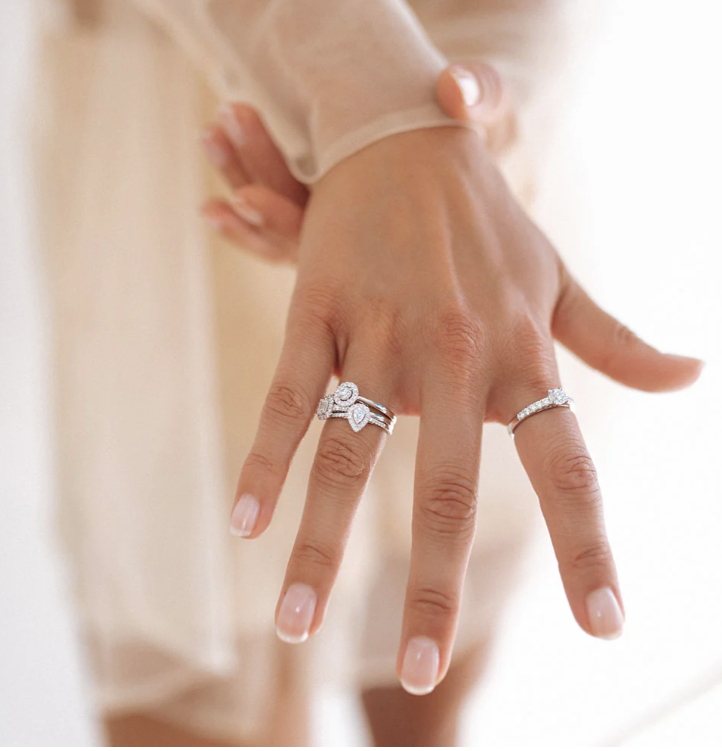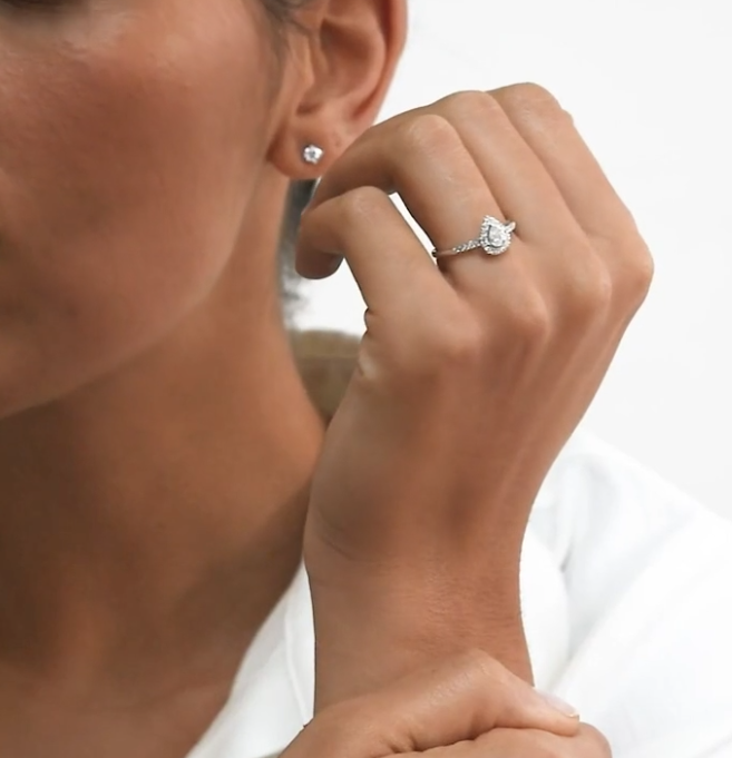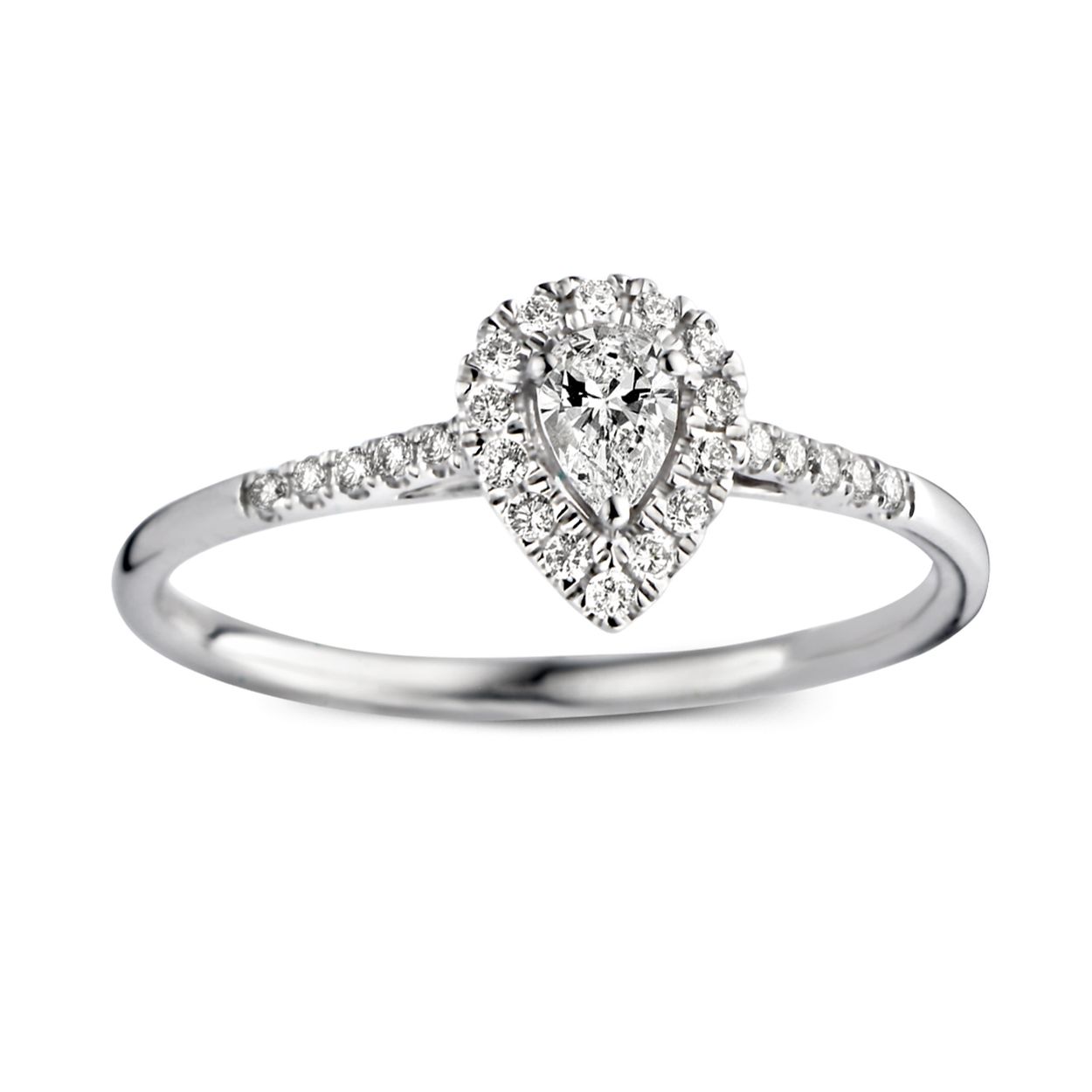 Een echte eyecatcher binnen de collectie is deze peervormige Elin ring! De fancy cut diamant is geslepen in peervorm en valt dan ook onmiddellijk op. De middensteen is bovendien omringd door kleinere briljant geslepen diamant voor een extra wauw-factor. Ook de scheen van de ring bevat fijne, fonkelende diamanten, wat de luxe uitstraling helemaal compleet maakt. De ring heeft een sierlijke verhoogde zetting, waardoor hij perfect gecombineerd kan worden met een gladde of diamanten rijring. Wat dacht je bijvoorbeeld van onze Millie ring?