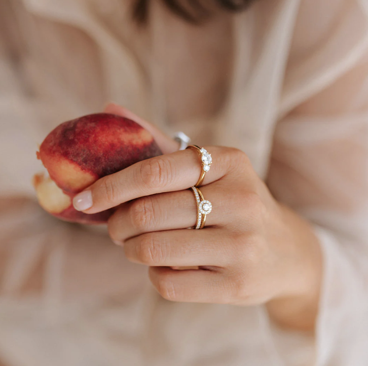 Alix is onze schitterende driesteensring! Zoals de naam al verklapt bevat de ring drie diamanten, waarbij de twee zijstenen de grote middensteen extra laten stralen. Bij een driesteensring staan de drie stenen symbool voor het verleden, heden en de toekomst. Het is daarom een perfecte ring voor speciale gelegenheden als bijvoorbeeld een verloving! We hebben Alix bovendien zo ontworpen dat er een aanschuif- of trouwring tegenaan gedragen kan worden. Wat dacht je bijvoorbeeld van onze Millie ring?