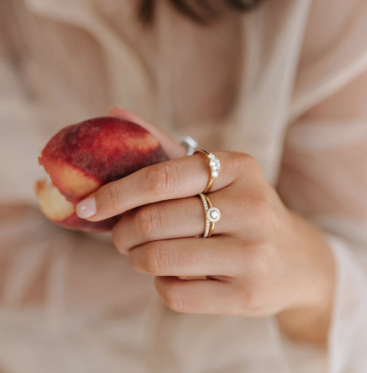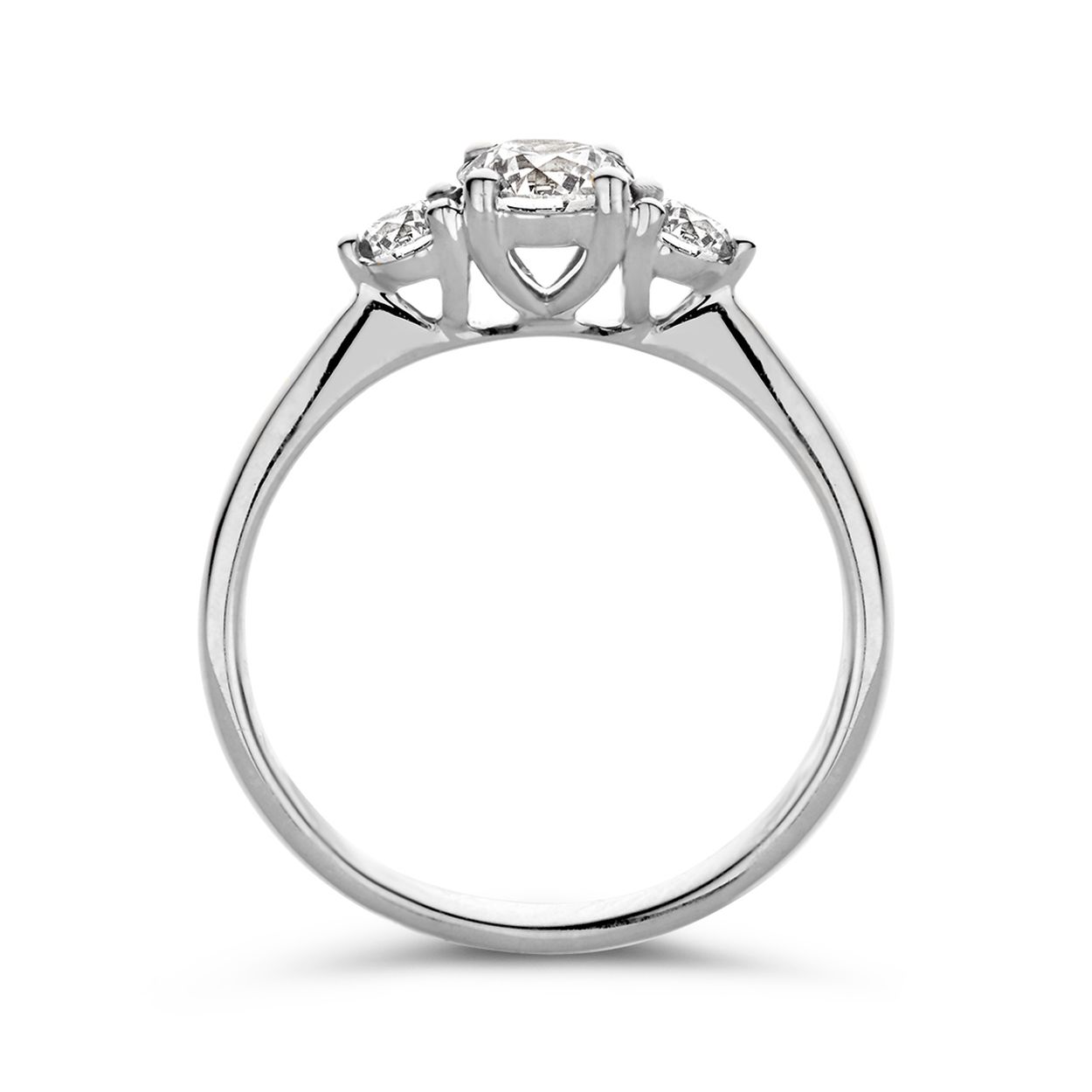 Alix is onze schitterende driesteensring! Zoals de naam al verklapt bevat de ring drie diamanten, waarbij de twee zijstenen de grote middensteen extra laten stralen. Bij een driesteensring staan de drie stenen symbool voor het verleden, heden en de toekomst. Het is daarom een perfecte ring voor speciale gelegenheden als bijvoorbeeld een verloving! We hebben Alix bovendien zo ontworpen dat er een aanschuif- of trouwring tegenaan gedragen kan worden. Wat dacht je bijvoorbeeld van onze Millie ring?