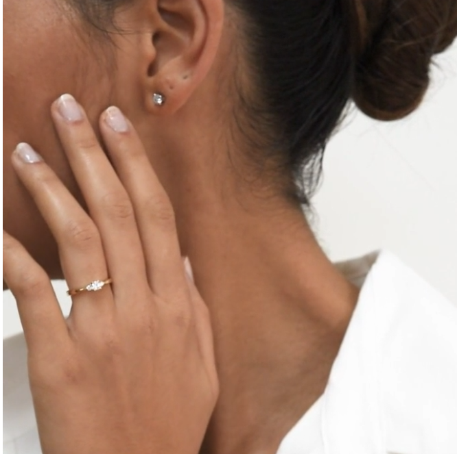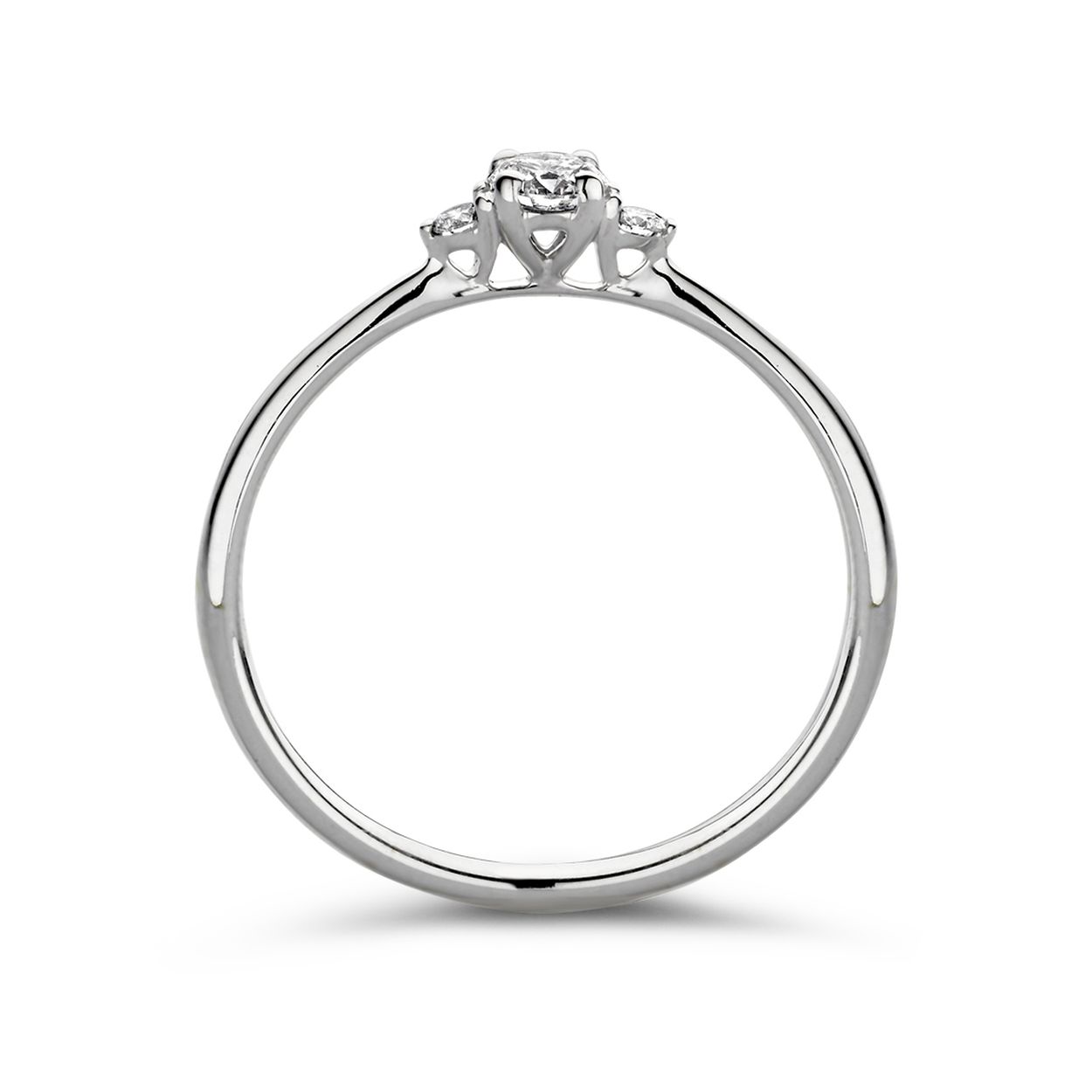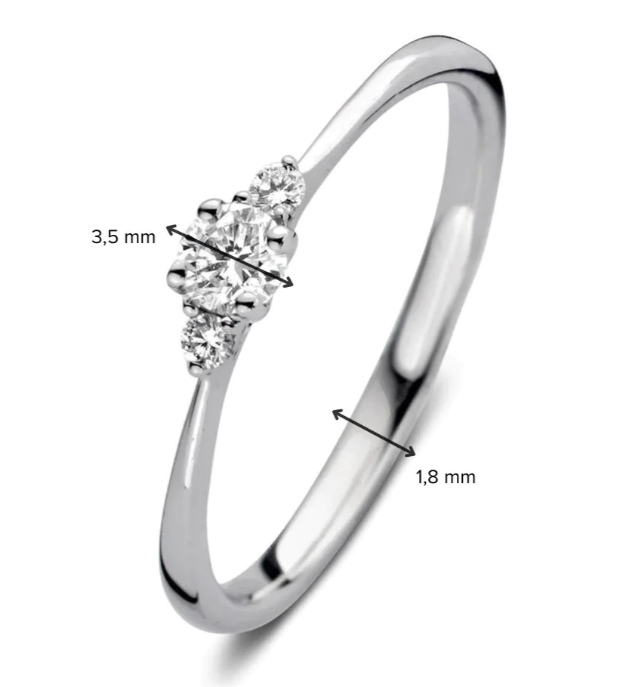18 Karaat wit gouden Aurore ring met 0.20 crt Lab-Grown Diamonds. Model Alix. Alix is onze schitterende driesteensring! Zoals de naam al verklapt bevat de ring drie diamanten, waarbij de twee zijstenen de grote middensteen extra laten stralen. Bij een driesteensring staan de drie stenen symbool voor het verleden, heden en de toekomst. Het is daarom een perfecte ring voor speciale gelegenheden als bijvoorbeeld een verloving! We hebben Alix bovendien zo ontworpen dat er een aanschuif- of trouwring tegenaan gedragen kan worden. Wat dacht je bijvoorbeeld van onze Millie ring? Kies zelf de gewenste steengrootte van jouw diamanten. De Alix ring is in verschillende maten en goudkleuren beschikbaar.