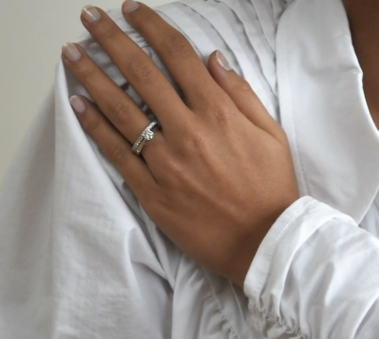 Ring Olivia is onderdeel van een set, in onze collectie zijn bijpassende oorbellen en een collier te vinden. De solitair is perfect te combineren met onze diamantenrijring Millie.