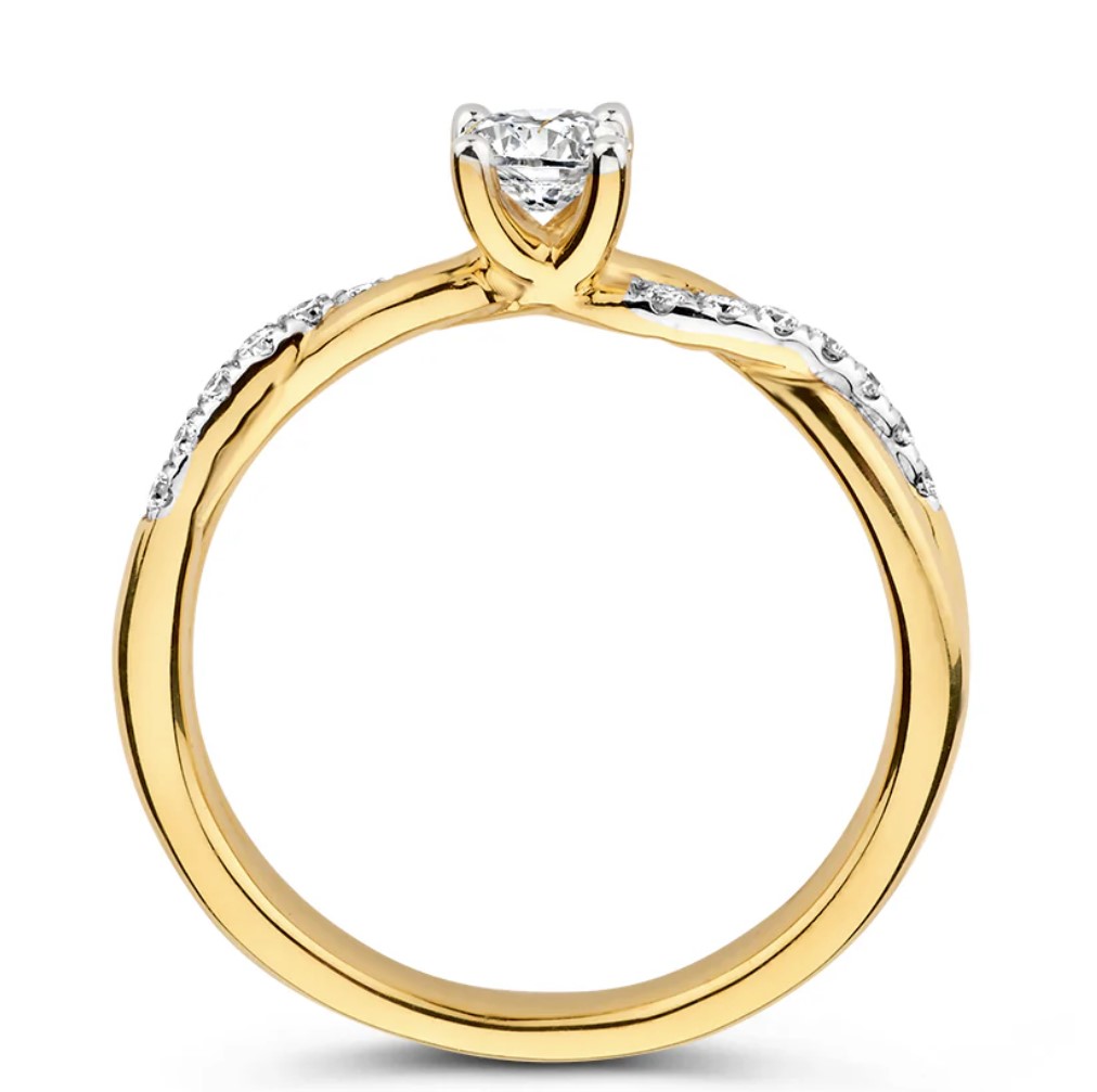 18 Karaat geelgouden ring 'Mia' is een meesterwerk van verfijning, met een betoverende solitair briljant middensteen van 0,30 ct. en een prachtige twistband, versierd met 14 sprankelende briljanten. Deze ring combineert klassieke elegantie met een moderne twist, waardoor hij perfect is voor elke gelegenheid.