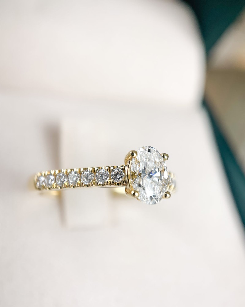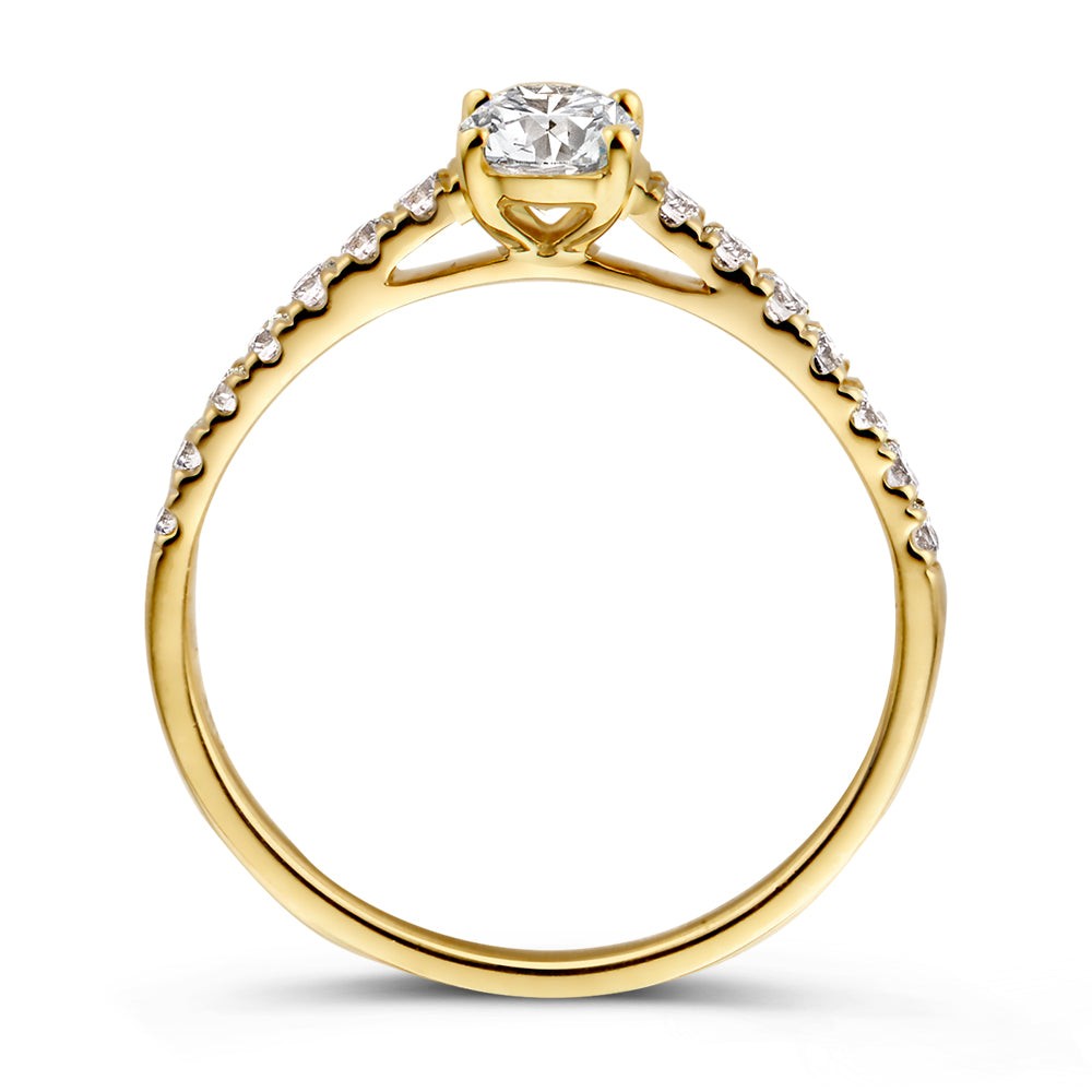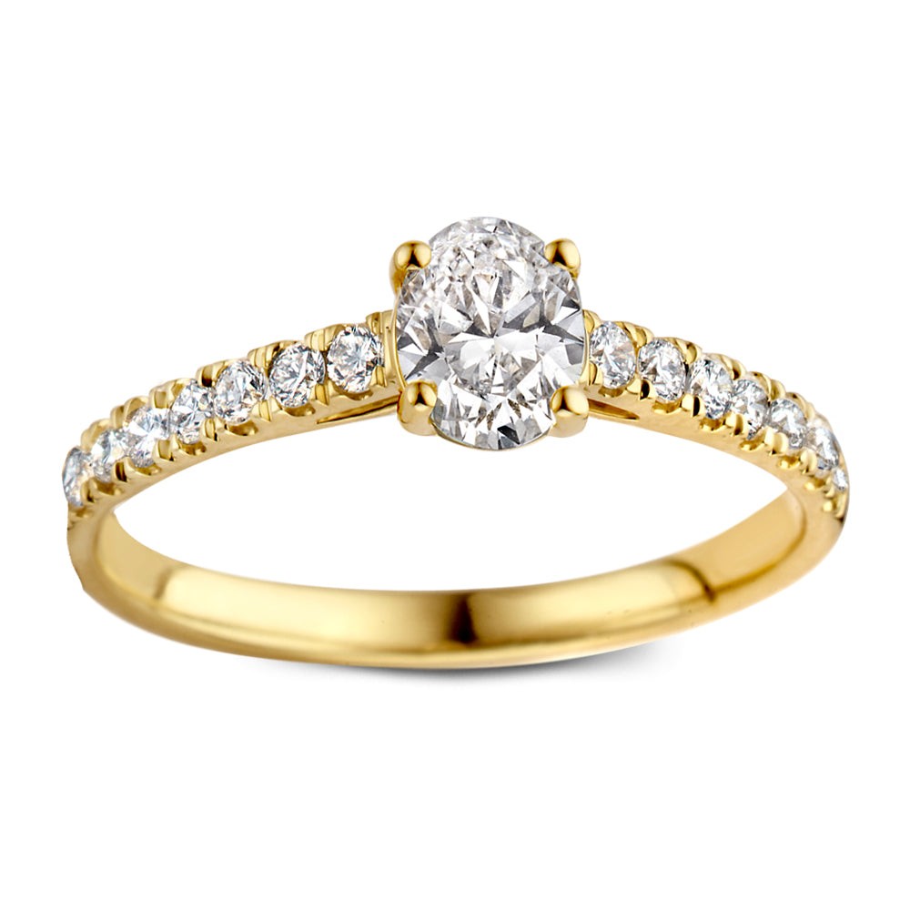 Ontdek de speelse en elegante ring Franky. Dankzij de ovaal geslepen diamant heeft deze solitair ring een opvallende uitstraling. Ovale diamanten schitteren optimaal en ogen bovendien groter. De diamanten in de band van de ring, maken deze royal versie extra vrolijk. Kies zelf de gewenste steengrootte van jouw diamant. De stijlvolle Franky ring is in verschillende maten en goudkleuren beschikbaar.