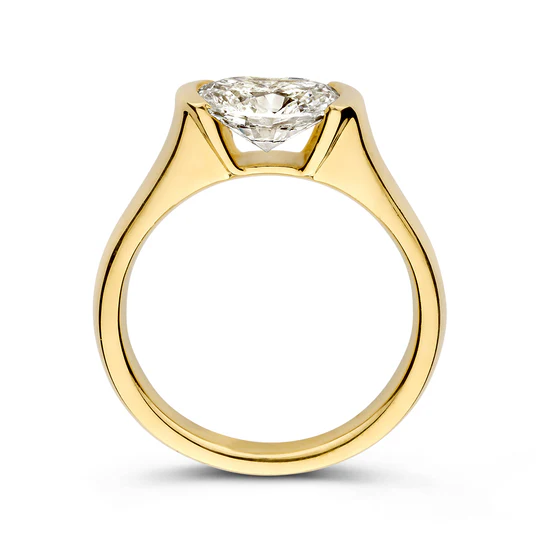 De diamant wordt vastgehouden in een spanzetting: een moderne zetwijze waarbij de steen stevig tussen twee goudranden geklemd zit. Deze techniek zorgt niet alleen voor een veilige bevestiging, maar laat ook veel lichtinval toe – wat de schittering van de ovale slijpvorm nog extra versterkt.