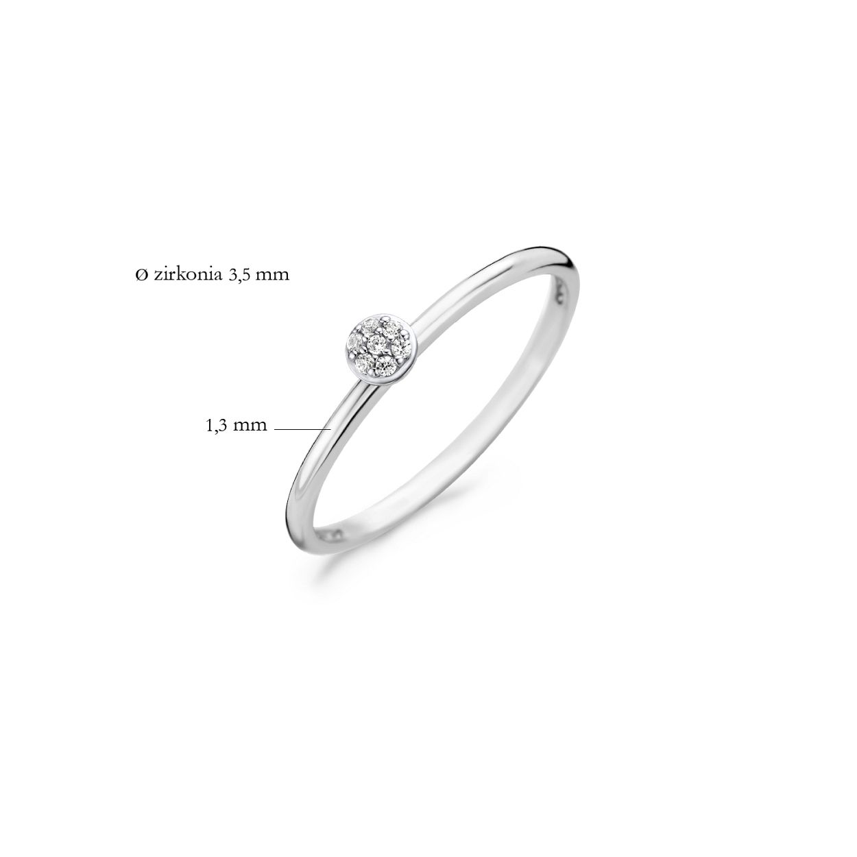 7 kleine ronde zirkonia’s schitteren in deze stijlvolle ring van 14k witgoud. De band is 1,3 mm breed en de steen heeft een grootte van 3,5 mm. Mooi op zichzelf of in combinatie met andere ringen