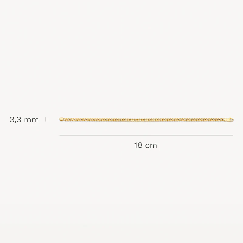 Deze moderne armband met gourmetschakels is gemaakt van 14k geelgoud en heeft een karabijnsluiting. Hij heeft een lengte van 18 cm en een doorsnede van 3,3 mm. Mooi op zichzelf maar ook goed te combineren met andere geelgouden sieraden uit onze collectie.