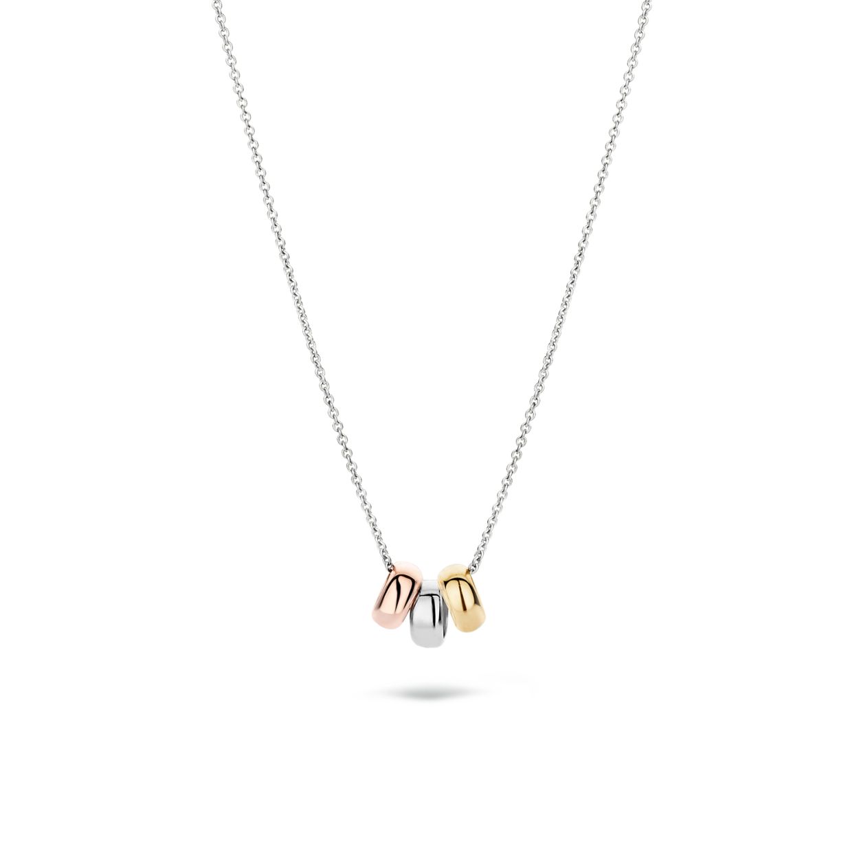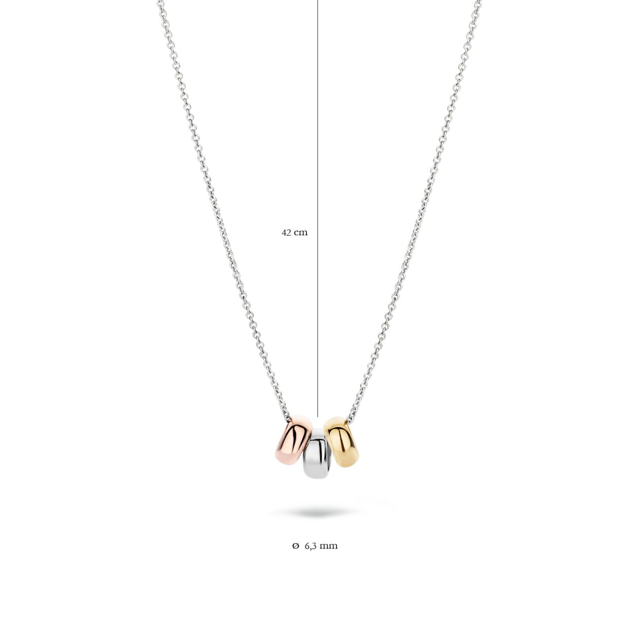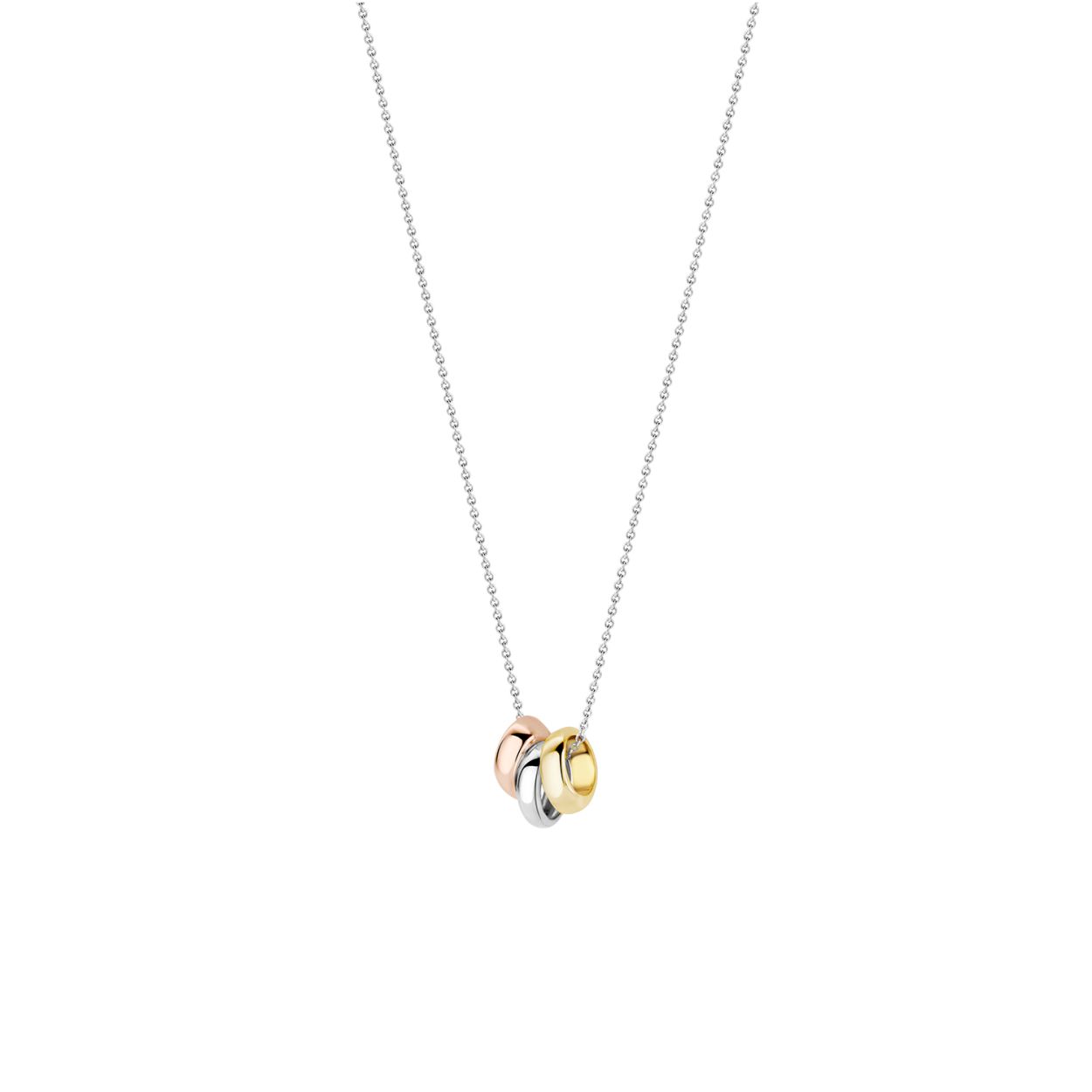 Deze speelse ketting van 14k witgoud valt op door de 3 apart bewegende ringvormige hangertjes van wit-, geel- en roségoud. Elke hanger heeft een doorsnede van 3,75 m. Het collier is 42 cm lang. Prachtig op zichzelf maar ook goed te combineren met andere sieraden uit onze collectie.