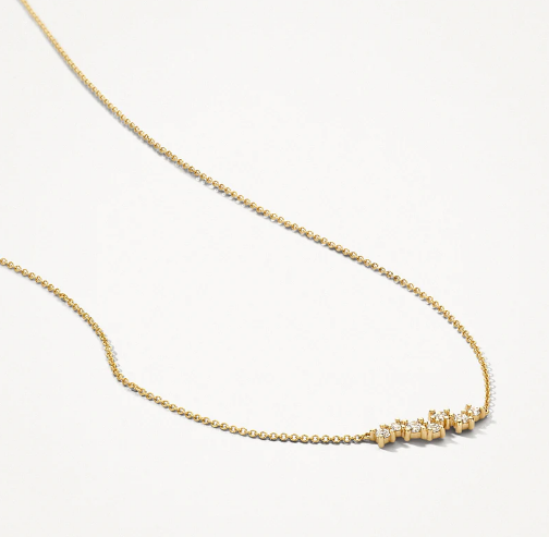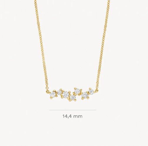Fantasierijk en verfijnd is dit collier in 14k geelgoud met daarin zirkonia’s in pavé-zetting. Het collier is 42 cm lang en is fraai te combineren met ring 1267YZI en oorknoppen 7373YZI in hetzelfde ontwerp.