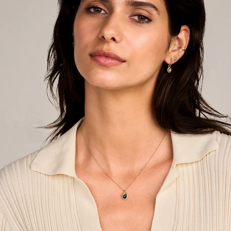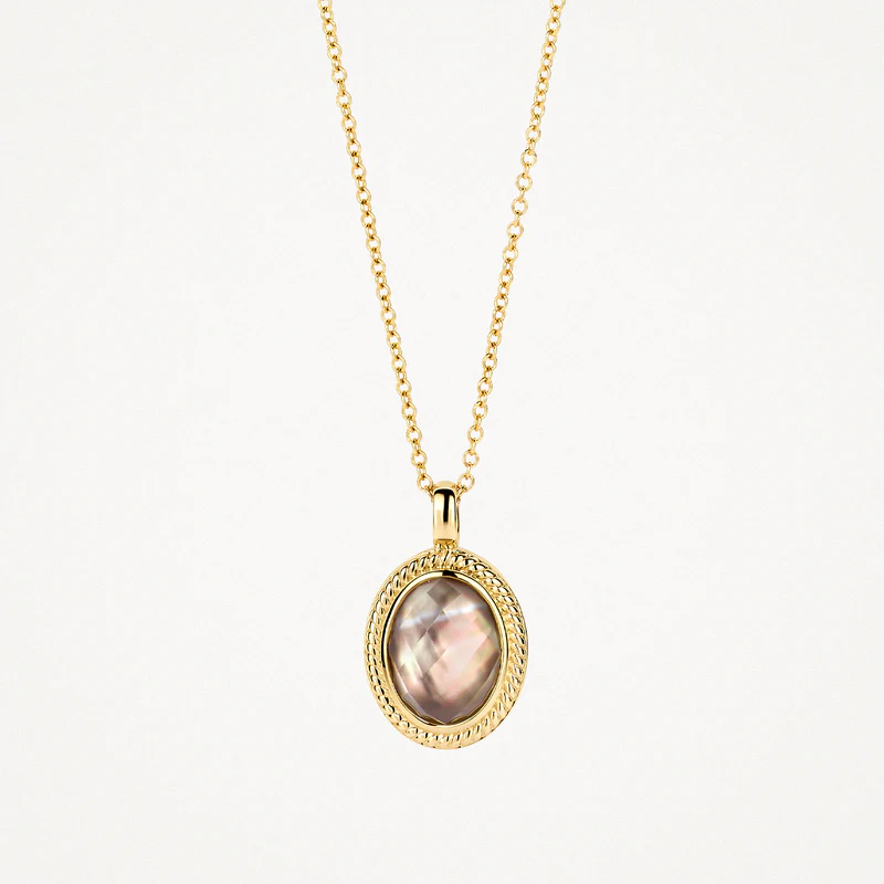 Dit 14k geelgouden collier wordt gesierd door een hanger met doublette van zwarte parelmoer en bergkristal in gladomzetting met kabelmotief. Het collier heeft een lengte van 42 cm en een veerringsluiting. Fraai op zichzelf of in combinatie met andere colliers uit onze collectie.