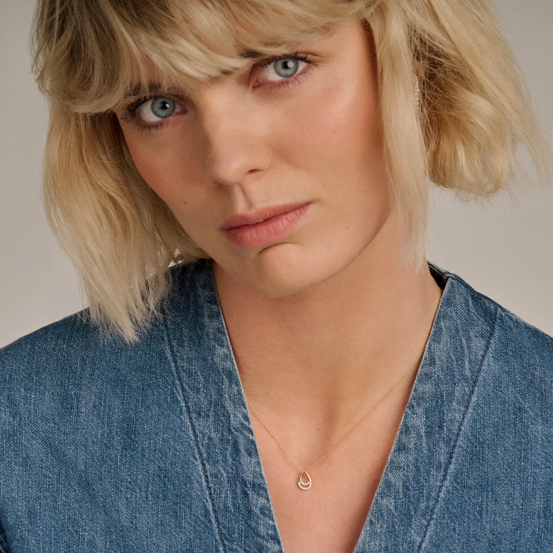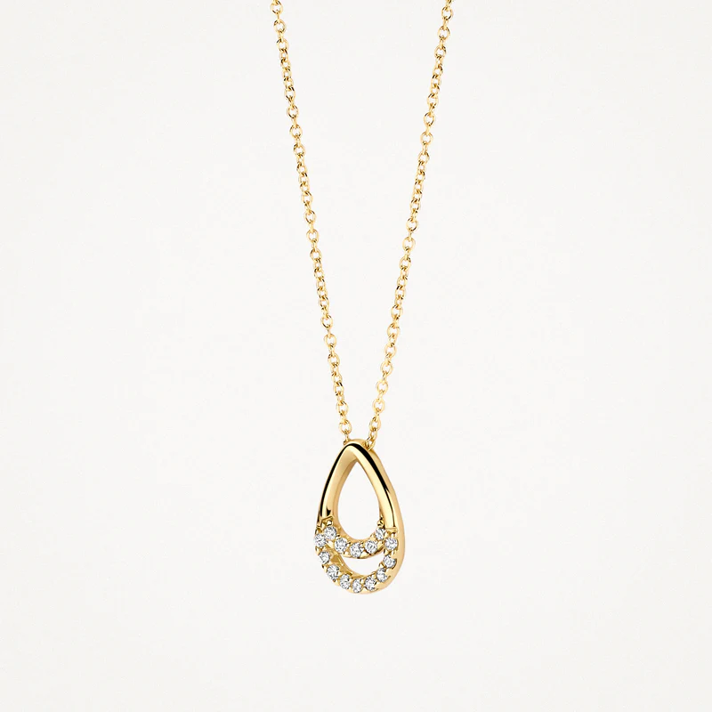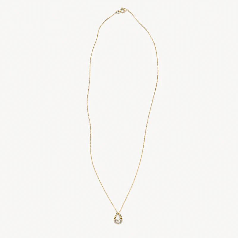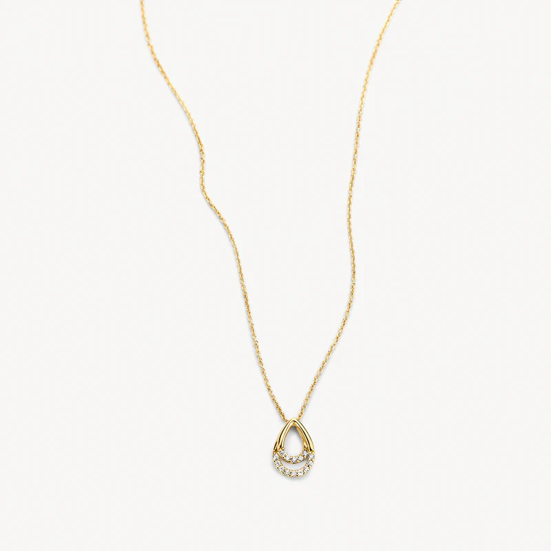 Deze verfijnde 14k geelgouden ketting, met een 42 cm lange anker schakel (⌀ 0.8 mm), combineert elegantie met subtiele schittering. De druppelvormige hanger (6.9x10 mm) is prachtig bezet met fonkelende zirkonia in een pavé-zetting.
