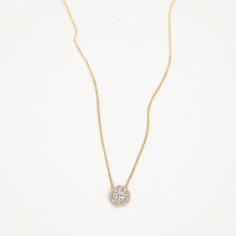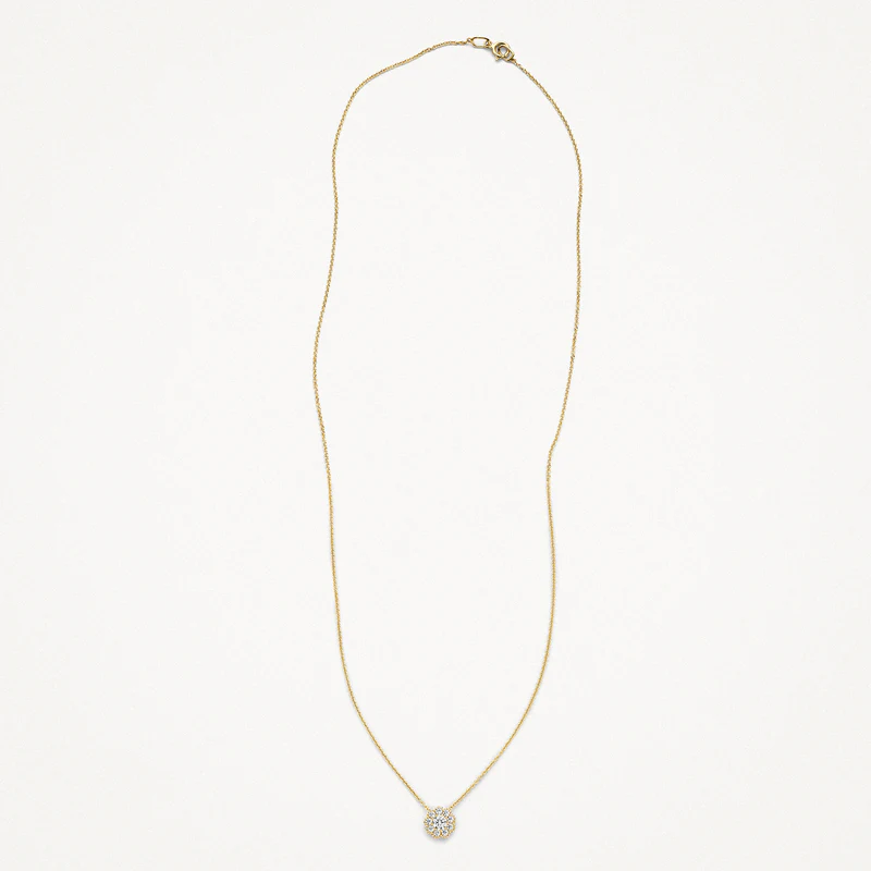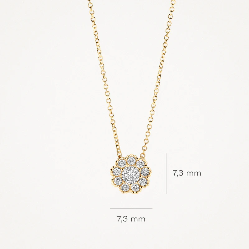 Ontdek deze verfijnde 14k geelgouden ketting van 42 cm met delicate ankerschakel (⌀ 0.8 mm). De hanger (⌀ 7.3 mm) pronkt met stralende zirkonia in een slimme illusiezetting, waardoor een sprankelend bloemmotief ontstaat. Geef jouw look een elegante glans met dit tijdloze collier.