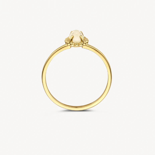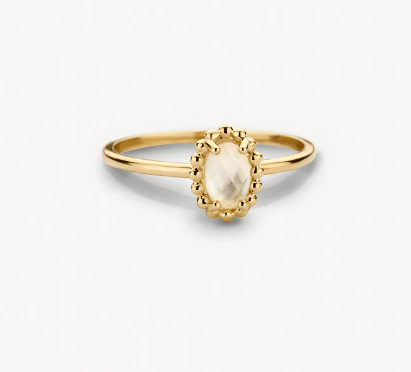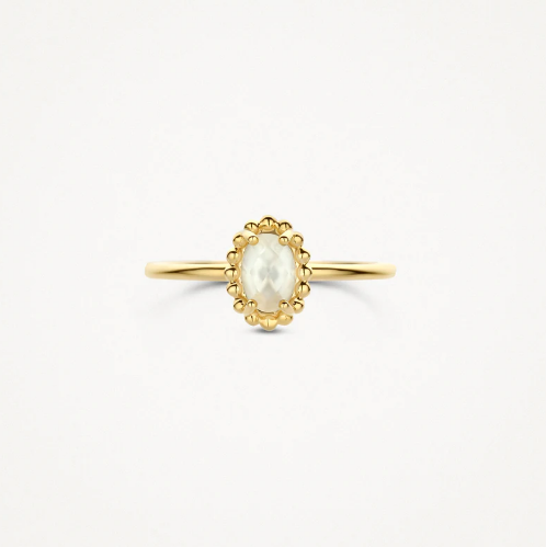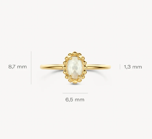Deze elegante 14k geelgouden ring is een echte eyecatcher met parelmoer en bergkristal in chaton-zetting omringd door een speels bolletjesmotief. De doorsnede van de band is 1,3 mm. Mooi te combineren met andere sieraden met parelmoer en bergkristal uit onze collectie.