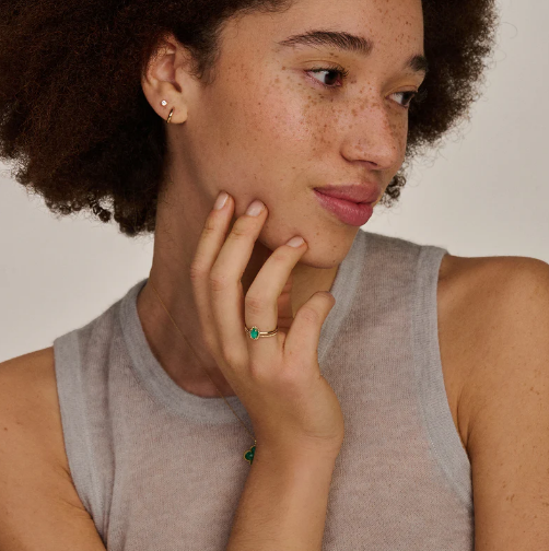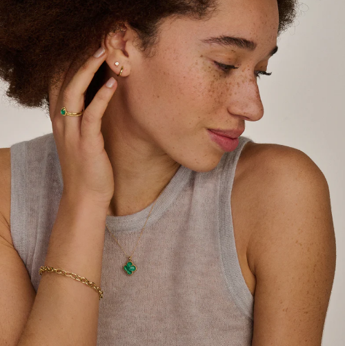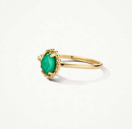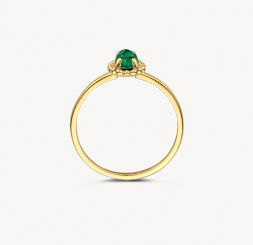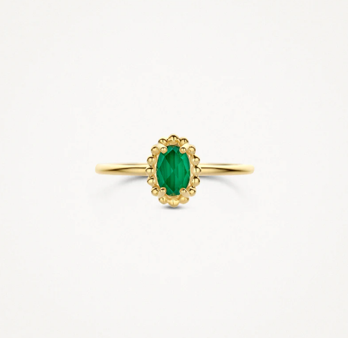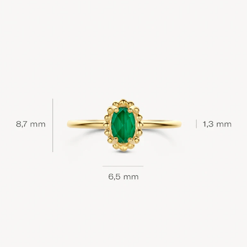 Deze elegante 14k geelgouden ring is een echte eyecatcher met de groene malachiet en bergkristal in chaton-zetting omringd door een speels bolletjesmotief. De doorsnede van de band is 1,3 mm. Mooi te combineren met andere sieraden met malachiet en bergkristal uit onze collectie.