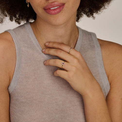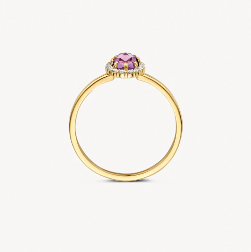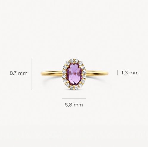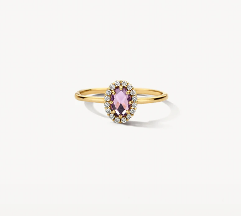 Een twist op een klassiek vormgegeven sieraad: deze 14k geelgouden ring wordt gesierd door paarse amethist omringd door zirkonia’s in pavé-zetting. De band heeft een doorsnede van 1,3 mm en de ring kan mooi gecombineerd worden met ander ringen uit onze collectie.