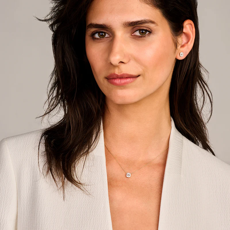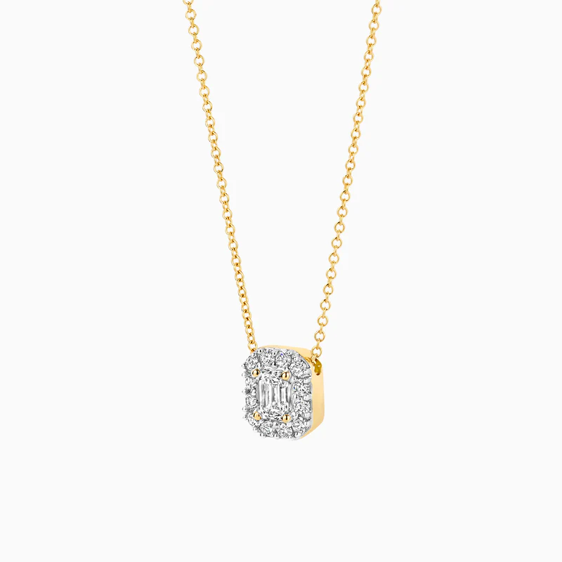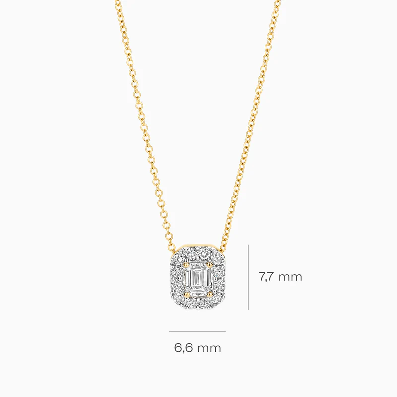 Een rechthoekige lab-diamond omringd door briljant geslepen lab-diamonds siert dit 14k geelgouden collier. De lengte van het collier is 42 cm. Draag hem alleen of in combinatie met andere sieraden met lab-diamonds uit onze collectie.