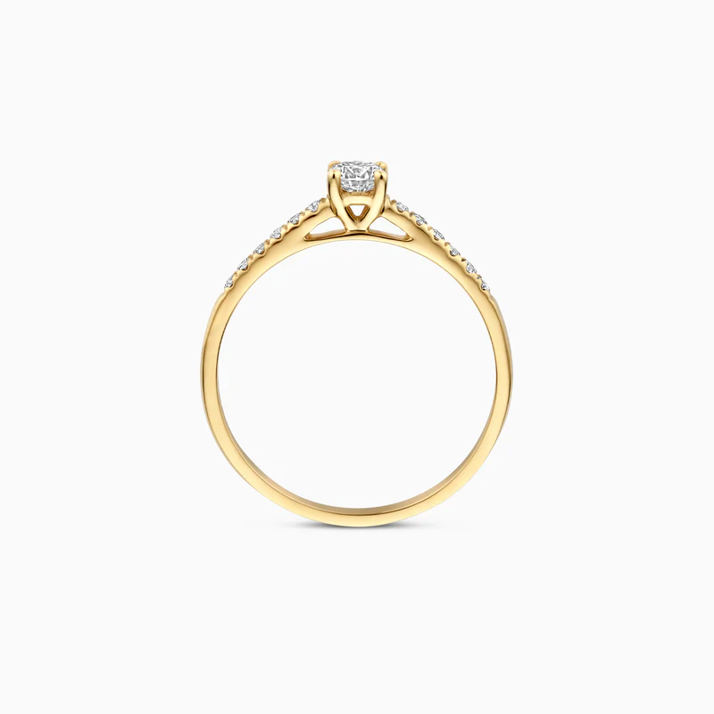 Deze schitterende 14k geelgouden ring is bezet met lab-diamonds in chaton- en pavé-zetting. Het totale karaatgewicht van de diamanten is 0,32, de doorsnede van de ring is 1,5 mm. Stijlvol op zichzelf of gecombineerd met andere sieraden met lab-diamonds uit onze collectie.