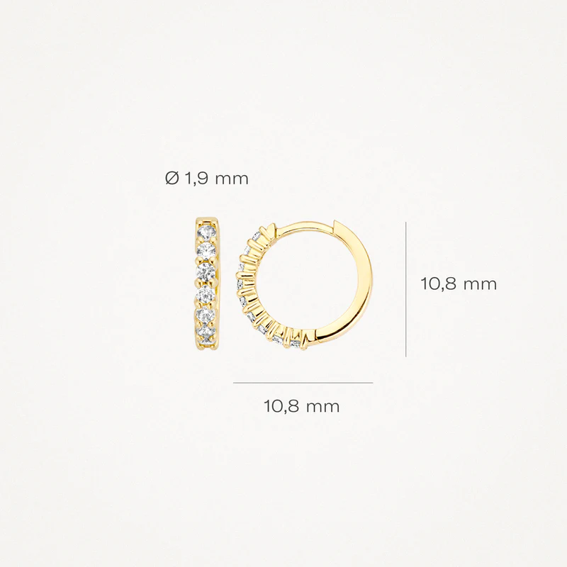 Deze sprankelende oorringen met witte zirkonia hebben een ronde vorm. Ze zijn gemaakt van 14k geelgoud en hebben een dikte van 1,9 mm en een hoogte van 12,5 mm. Prachtig op zichzelf, maar ook heel mooi in combinatie met oorbedels en andere (oor)sieraden uit onze collectie.