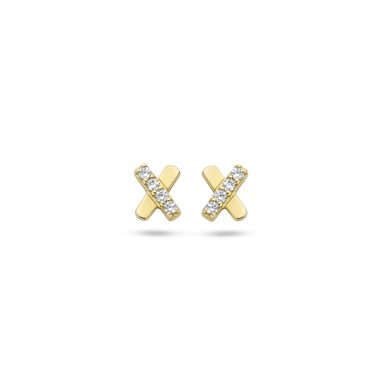 De x-vormige Blush oorbellen met geelgoud gecombineerd met de diamantgeslepen zirkonia's van deze Blush oorbellen vormen samen een perfecte eenheid. De geelgouden zetting van deze oorstekers zorgt voor verfijnde elegantie. Geschikt om tijdens elke gelegenheid te dragen zorgen deze zirkonia Blush oorbellen voor extra glans.