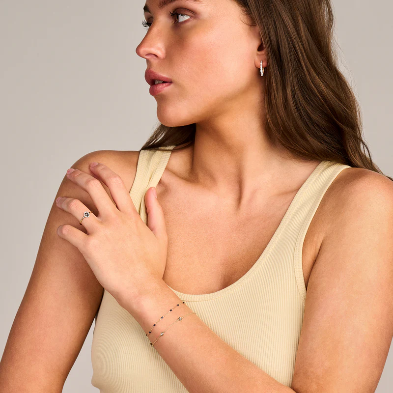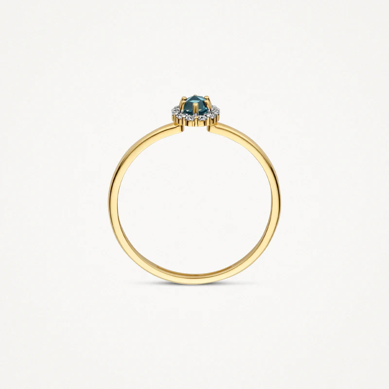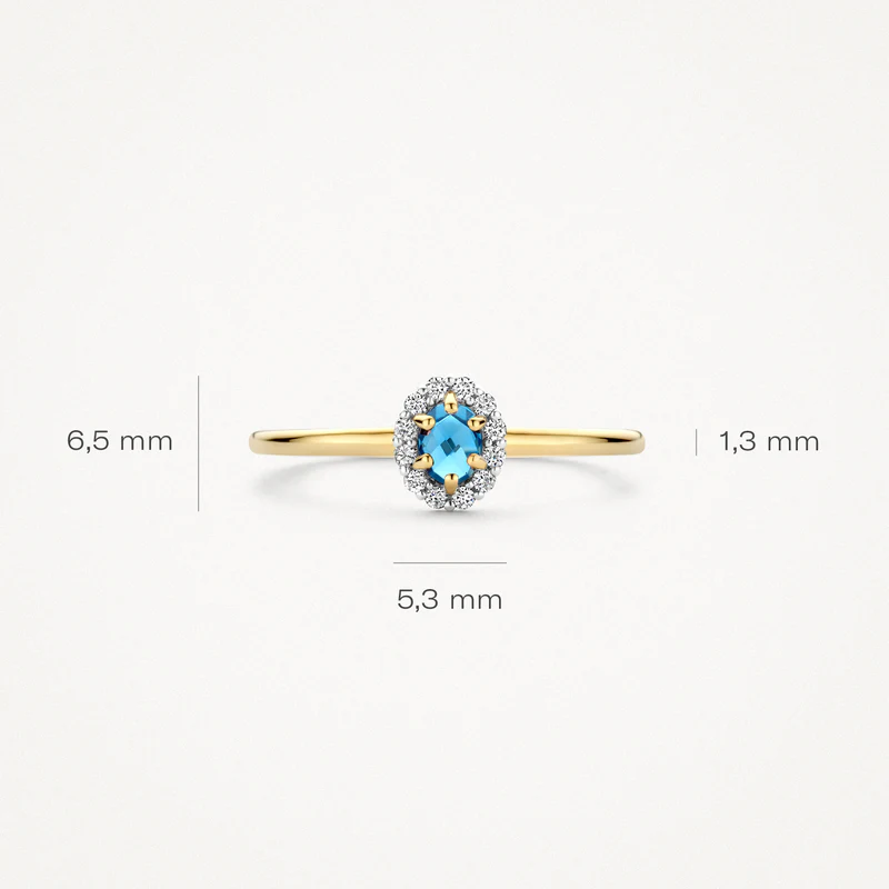 Deze 14k geelgouden ring springt in het oog door helderblauwe topaas omringd door zirkonia. De band heeft een doorsnede van 1,3 mm en de ring is prachtig te combineren met een of meer andere (aanschuif)ringen uit onze collectie.