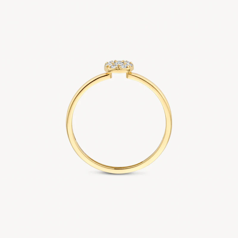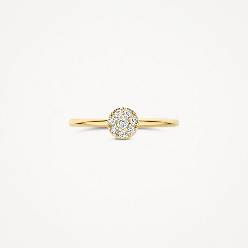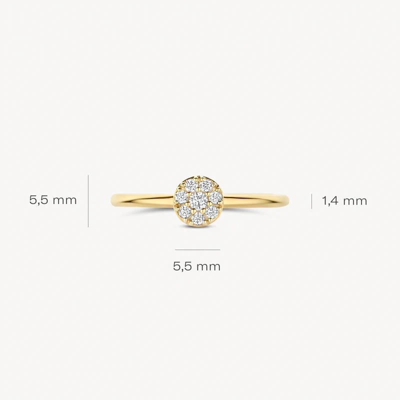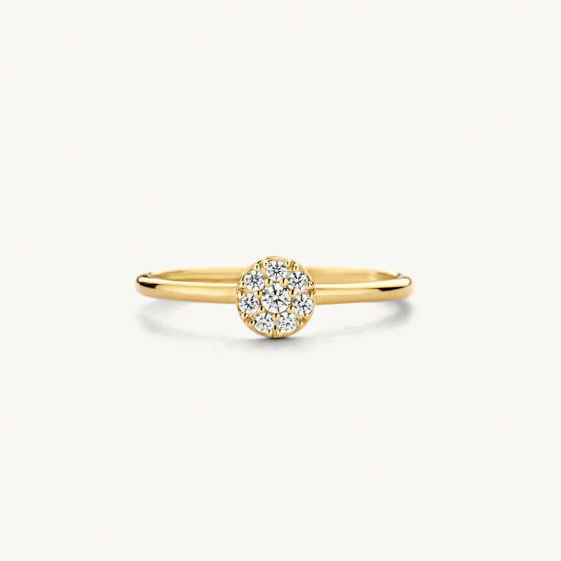 Ontdek deze verfijnde ring, vervaardigd uit 14k geelgoud. Je ziet een slanke band die subtiel overgaat in een cirkelvormig cluster van schitterende zirkonia's. Deze zijn zorgvuldig pavé gezet voor maximale glans. Met een banddikte van ⌀ 1.4 mm draagt hij comfortabel en elegant. Een tijdloze toevoeging aan jouw sieradencollectie.