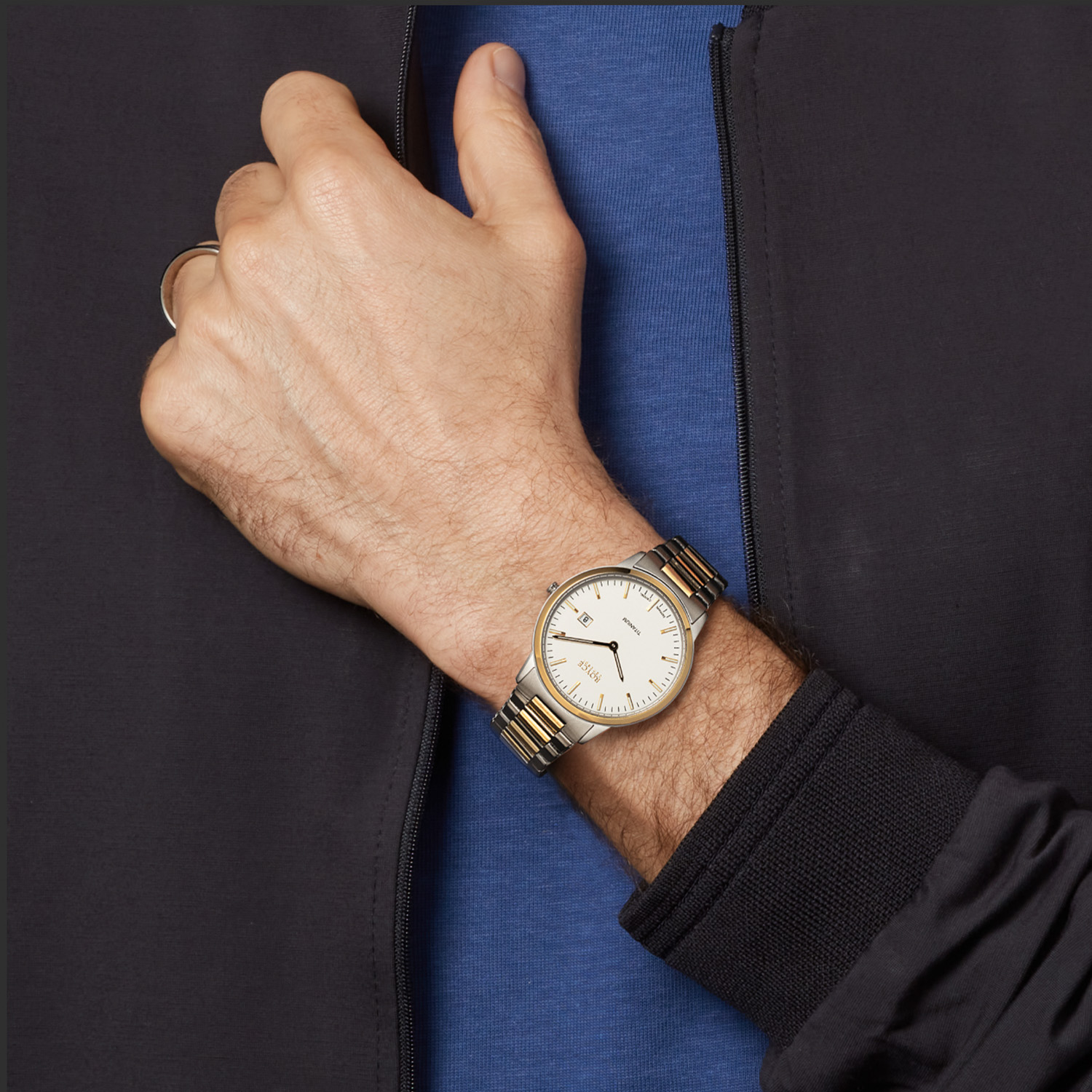 Dit herenhorloge van Boccia heeft een klassieke uitstraling. De 3658-07 heeft een ronde titanium horlogekast met een goudkleurige bezel, een witte wijzerplaat met een datum en een doorsnee van 39mm. De wijzers en uurstrepen zijn ingelegd met lumibrite. Aan de kast zit een mat glanzende bicolor titanium schakelband met een vouwsluiting. Het horloge heeft een saffierglas en is 10ATM. Of je nu klassiek of chique gekleed gaat, dit horloge past bij elke outfit en iedere gelegenheid!