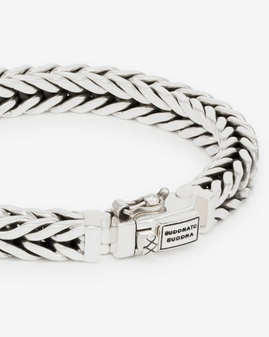 De Barbara Armband, een icoon uit onze collectie, is een perfecte balans tussen kracht en verfijning. Met zijn kenmerkende vierkante schakels en gedetailleerde ontwerp, vertelt deze armband een verhaal van vakmanschap en passie. Het duurt dagen om de alle fijne schakels van een Barbara armband in elkaar te weven. Vervaardigd uit duurzaam gerecycled 925 zilver en ontworpen in Amsterdam. Hoewel breder dan de Barbara XS, blijft deze armband verrassend elegant en kan hij moeiteloos gecombineerd worden met andere Buddha to Buddha-sieraden. Een tijdloos sieraad dat generaties lang gekoesterd zal worden. Met wie of wat verbind jij jezelf door deze armband te dragen?