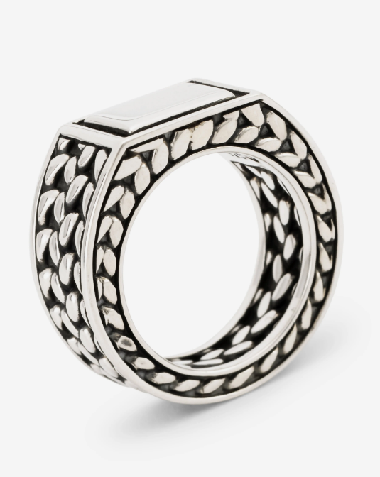 De Julius Signet ring is geïnspireerd op een traditioneel weefpatroon en straalt passie uit. De zilveren Julius sieraden van Buddha to Buddha worden nog steeds ambachtelijk vervaardigd door de beste lokale zilversmeden van Zuidoost-Azië, volgens traditionele methoden. Deze ring is een krachtige, stijlvolle toevoeging aan je sieradencollectie en behoort tot de categorie bredere ringen. Hij is ontworpen in Amsterdam en gemaakt van 925 gerecycled sterling zilver in Zuidoost-Azië. Deze zegelring is bovendien te personaliseren, waardoor het een extra speciaal cadeau wordt voor een dierbaar persoon. Bij ons koop je geen sieraden, je geeft ze cadeau. Aan wie geef jij dit sieraad? Jezelf, of iemand in het bijzonder?