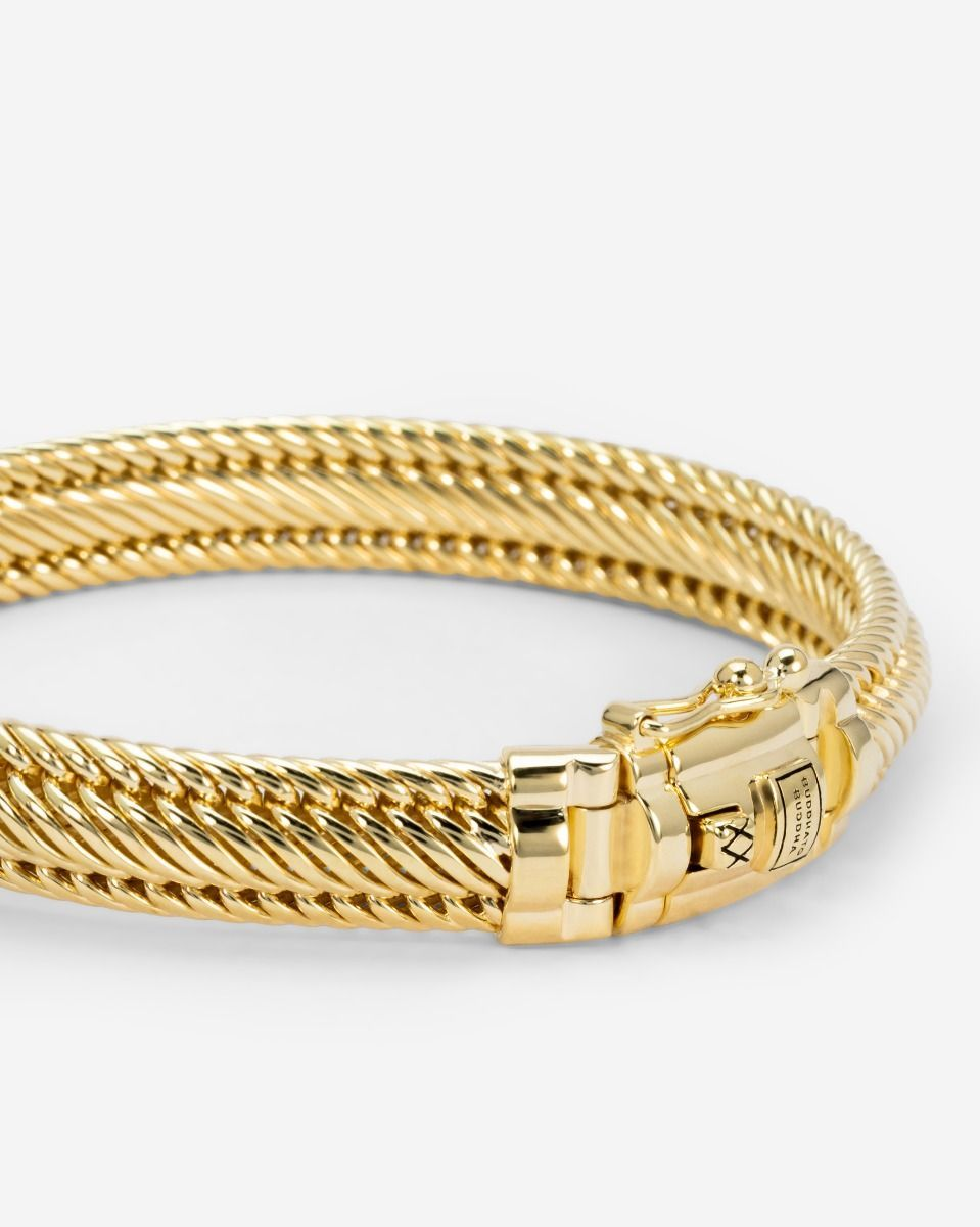 De Edwin-collectie behoort tot een van de meest geliefde collecties van Buddha to Buddha. De Edwin Mini-armband is verfijnd met een krachtige uitstraling en heeft een slankere vorm dan de Edwin Small-armband. Elk stuk is met de hand vervaardigd en bezit de tijdloze kenmerken die de  Buddha to Buddha sieraden typeren. Ontworpen in Amsterdam en handgemaakt in Zuid-Oost Azië van gerecycled zilver met een premium gold plating (3.0 micron dik). De plating is gemiddeld 5 maal dikker dan reguliere gold plated items. Je koopt onze sieraden niet, maar je geeft ze cadeau. Aan wie geef jij dit sieraad?
