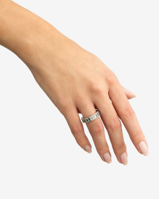 De Esther Small Ring, gemaakt met ons iconische Esther design, is een toonbeeld van vakmanschap en stijl. Met haar kenmerkende geoxideerde schakels krijgt de ring een diepe, donkere nuance aan de binnenkant, wat een prachtig contrast biedt met het glanzende sterling zilver. De robuuste, gevlochten schakel, typerend voor de Esther-collectie, voegt een krachtig element toe, terwijl de smalle ring zijn verfijnde look behoudt. Ontworpen in Amsterdam en met toewijding handgemaakt in Zuidoost-Azië, is deze ring zowel tijdloos als modern. Welk verhaal ga jij vertellen met de Esther Small Ring om je vinger?