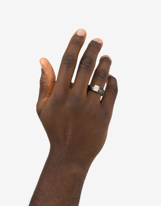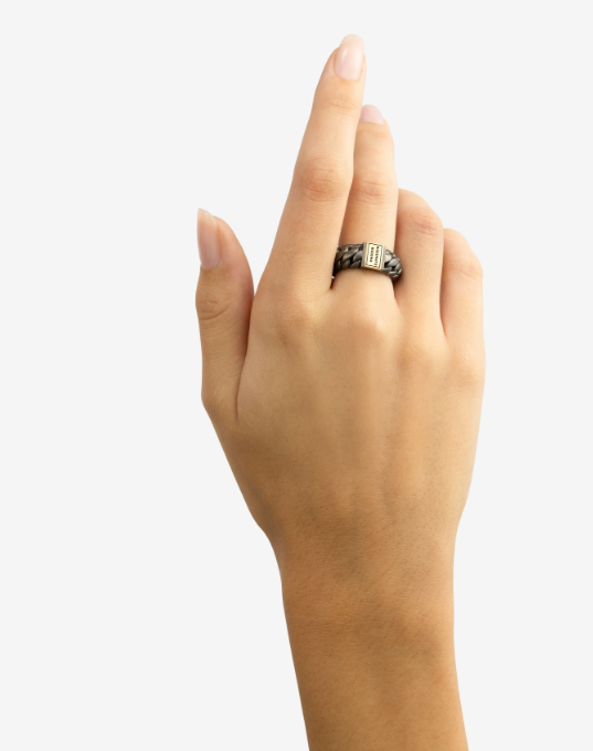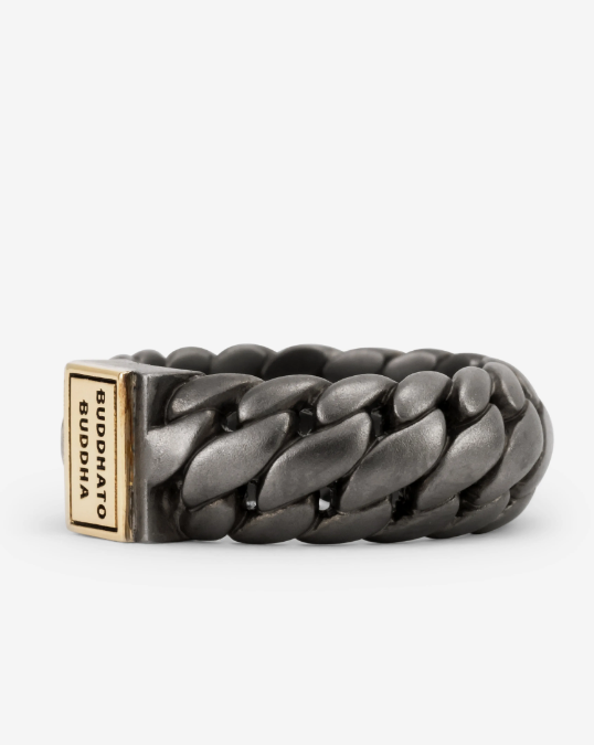 Het ontwerp van de Ben Small ring is aangepast met een unieke matte rhodium finishing en 14k geelgouden details. Jouw levensstijl en de natuurlijke elementen bepalen de look van je sieraad in de loop van tijd en creëren een vintage en ruwe uitstraling die een persoonlijk statement is van jouw reis door het leven. Deze ring valt in de categorie brede ringen. Let op! Deze unieke rhodium finish is zo ontwikkeld dat je sieraad een vintage look krijgt naarmate je het draagt. Zo ontwikkel je een eigen look, passend bij jou levensstijl.