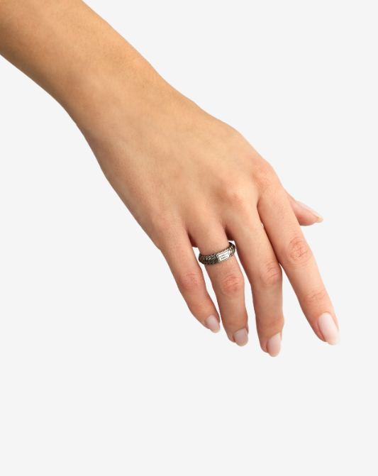 Het ontwerp van de Ben XS ring is aangepast met een unieke glanzende rhodium finishing en gepolijste zilveren details. Jouw levensstijl en de natuurlijke elementen bepalen de look van je sieraad in de loop van tijd en creëren een vintage en ruwe uitstraling die een persoonlijk statement is van jouw reis door het leven. Deze ring valt in de categorie smalle ringen.Let op! Deze unieke rhodium finish is zo ontwikkeld dat je sieraad een vintage look krijgt naarmate je het draagt. Zo ontwikkel je een eigen look, passend bij jouw levensstijl.